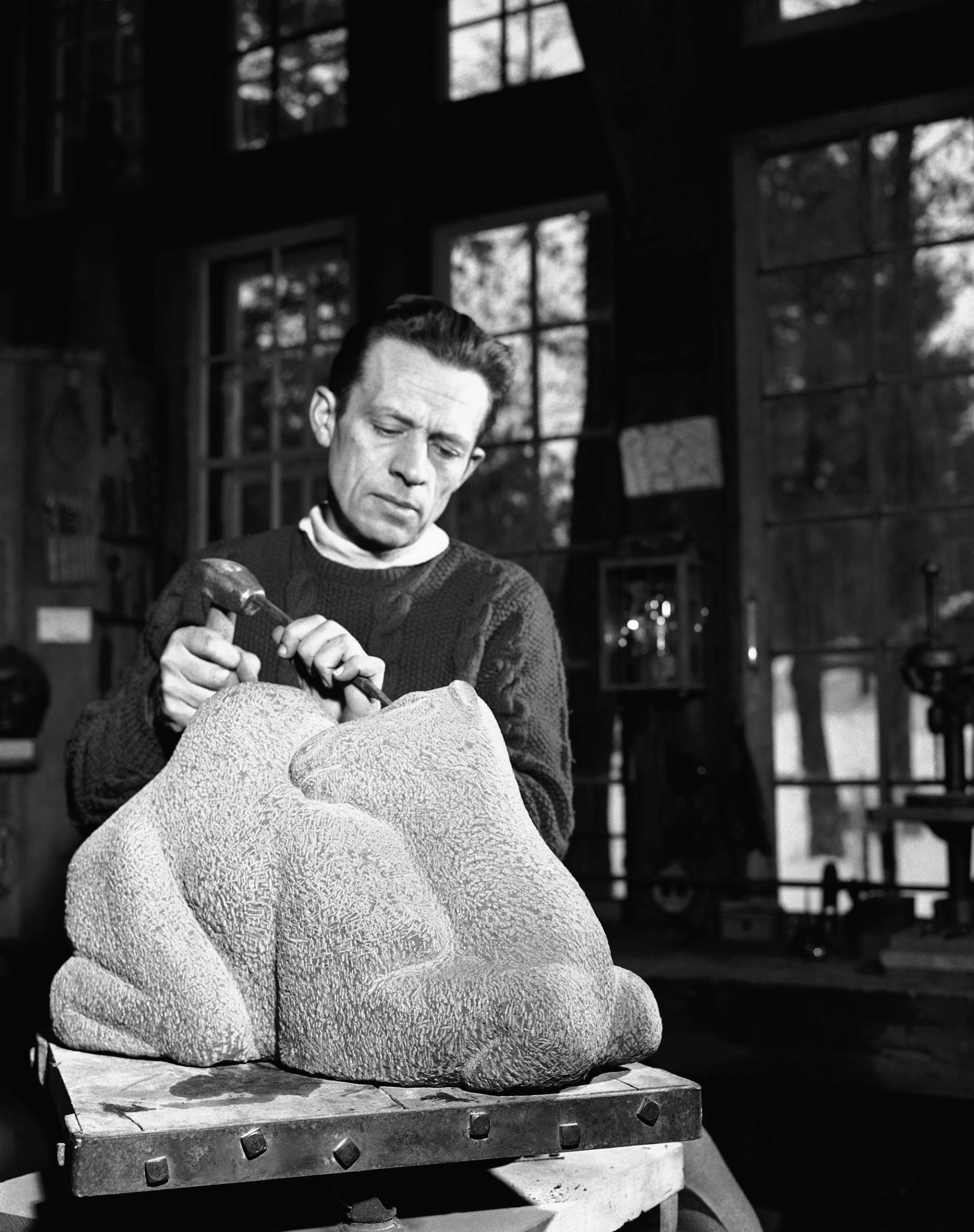 Harvey Fite working on a figure of a sleeping camel inside his quarry studio in upstate New York, 26 February 1948 AP Photo/RAW