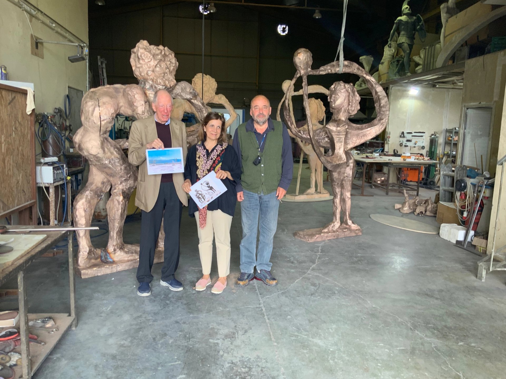 From left, Jacob Rothschild; Evita Arapoglou, the biographer of Niko Ghika; and Alekos Pappas at the Kaparos foundry with the figures of Odysseus and Nausicaa before patination