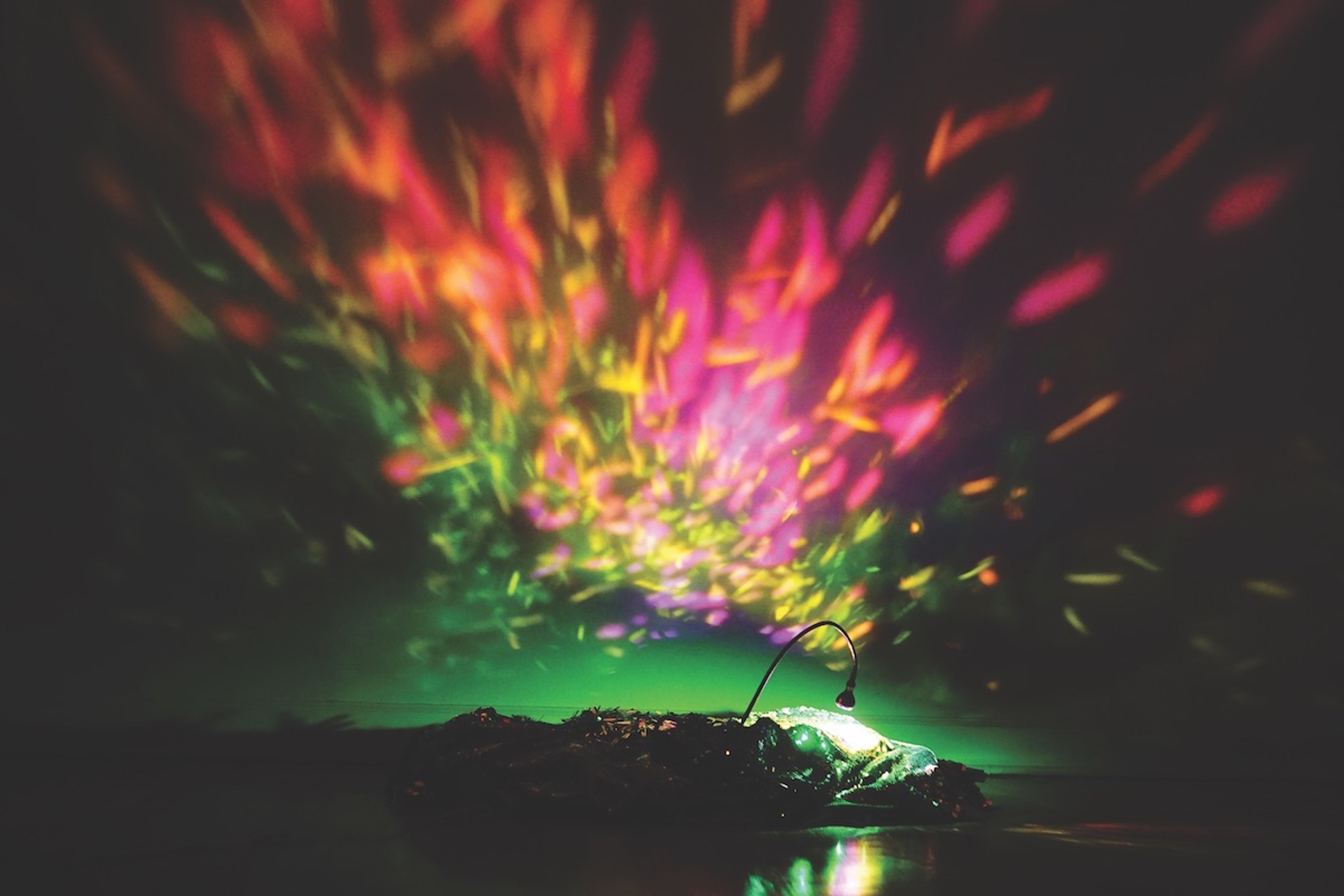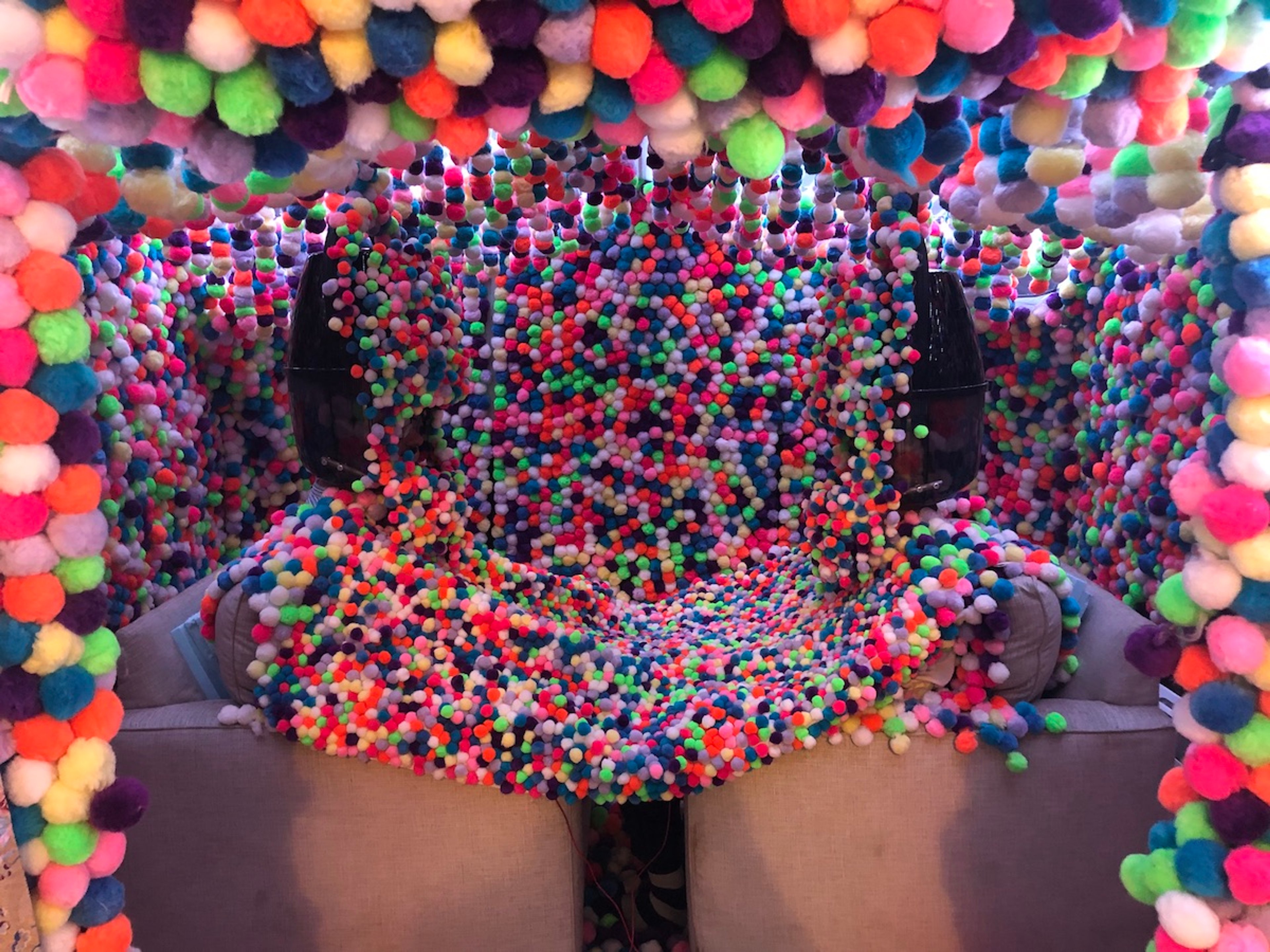 In this immersive and interactive work, the Brooklyn-based artist aims to create an experience reminiscent of “soul gazing” exercises in Tantra involving nonverbal communication. Visitors sit across from the artist within a closed dome bedecked with colourful pompoms, and are then tucked under a weighted blanket and fitted with an eyepatch, a headset and headphones that emit music by Eluvium, the moniker of the ambient composer Matthew Cooper. The artist asks that you maintain eye contact throughout the three-minute experience, which facilitates a psychedelic optical illusion. “You have to maintain eye contact or it doesn’t work,” the artist explains. Bobby Anspach, Place for Continuous Eye Contact, 2017