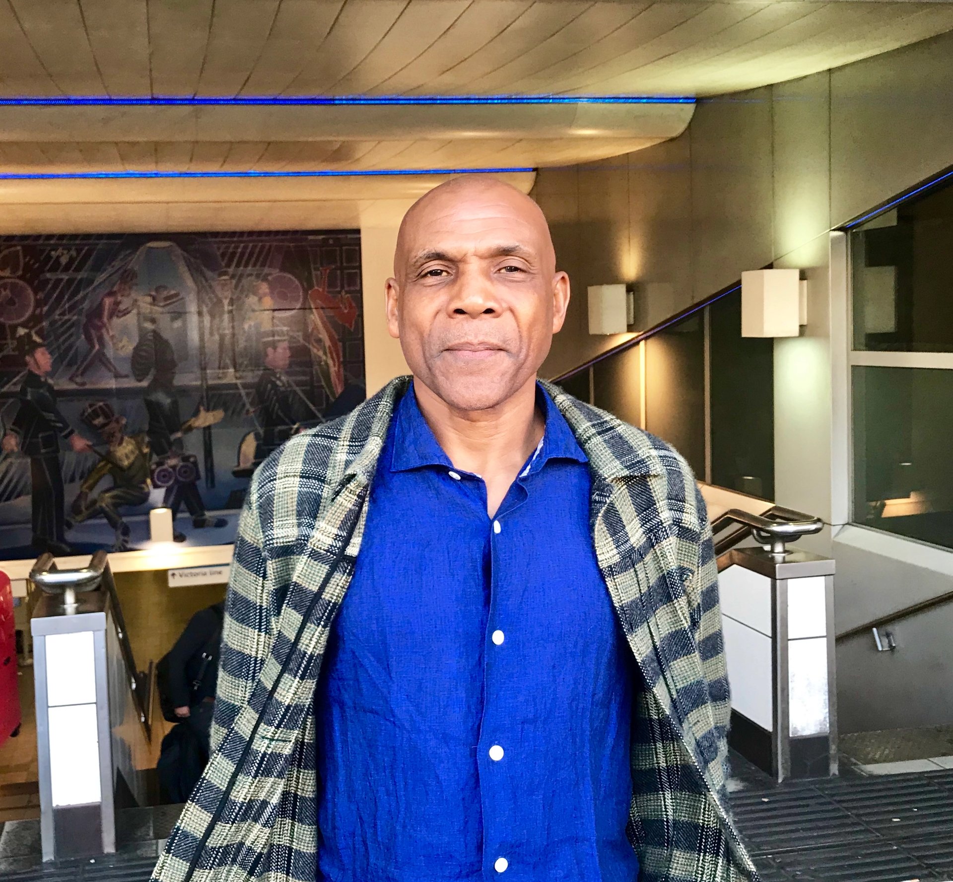 Denzil Forrester in front of his new public commission Courtesy Louisa Buck