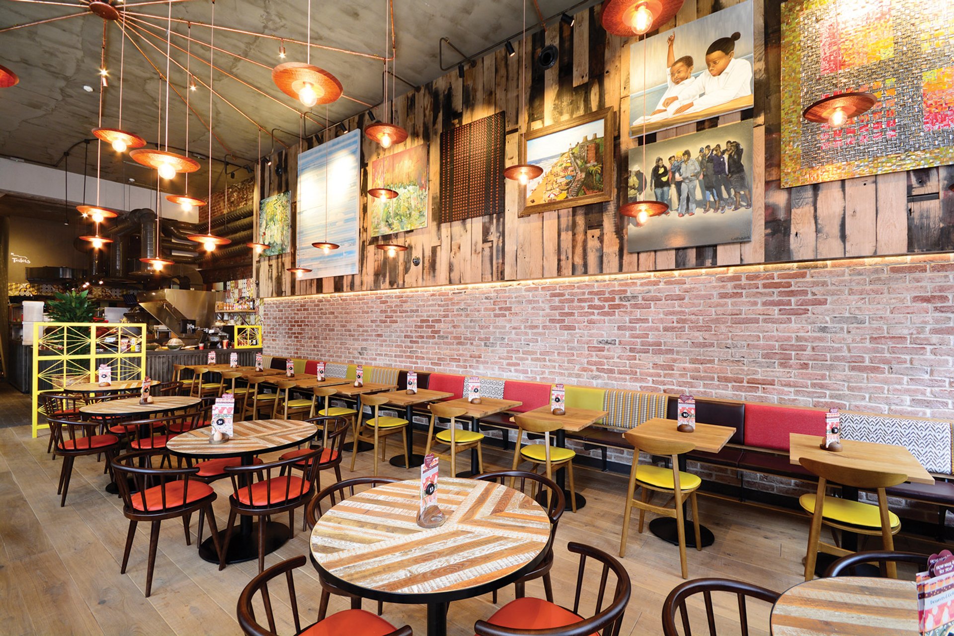 Nando’s restaurant in Bristol, UK, with a work by Patrick Bongoy (black and red, centre) © Nando's