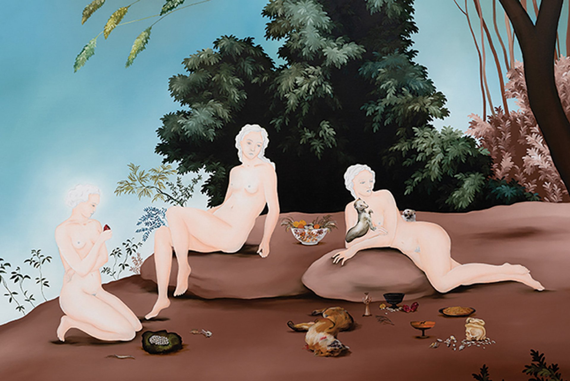 Known for her rich landscape paintings dotted with pale women, the Belgium-based Sanam Khatibi draws from Old Masters like Hieronymus Bosch and Lucas Cranach. Picked up by New York’s PPOW gallery last November, the artist’s first solo show with the gallery—and in the US—features new paintings that present a peculiar, Renaissance-esque Eden with a surrealist bent.