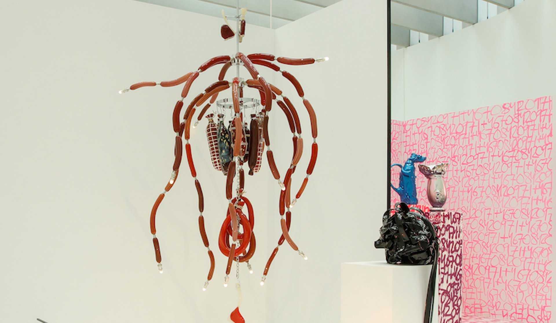 Czeresko has another iteration of the meat chandelier in the New Glass Now exhibition at the museum, a sweeping survey of contemporary glass works of art that includes such artists as Bohyun Yoon, Frederick Nielson and Dustin Yellin. Her work Meat Chandelier (2018) comprises blown glass resembling sausages and other kinds of meat assembled in the style of traditional Venetian chandeliers.