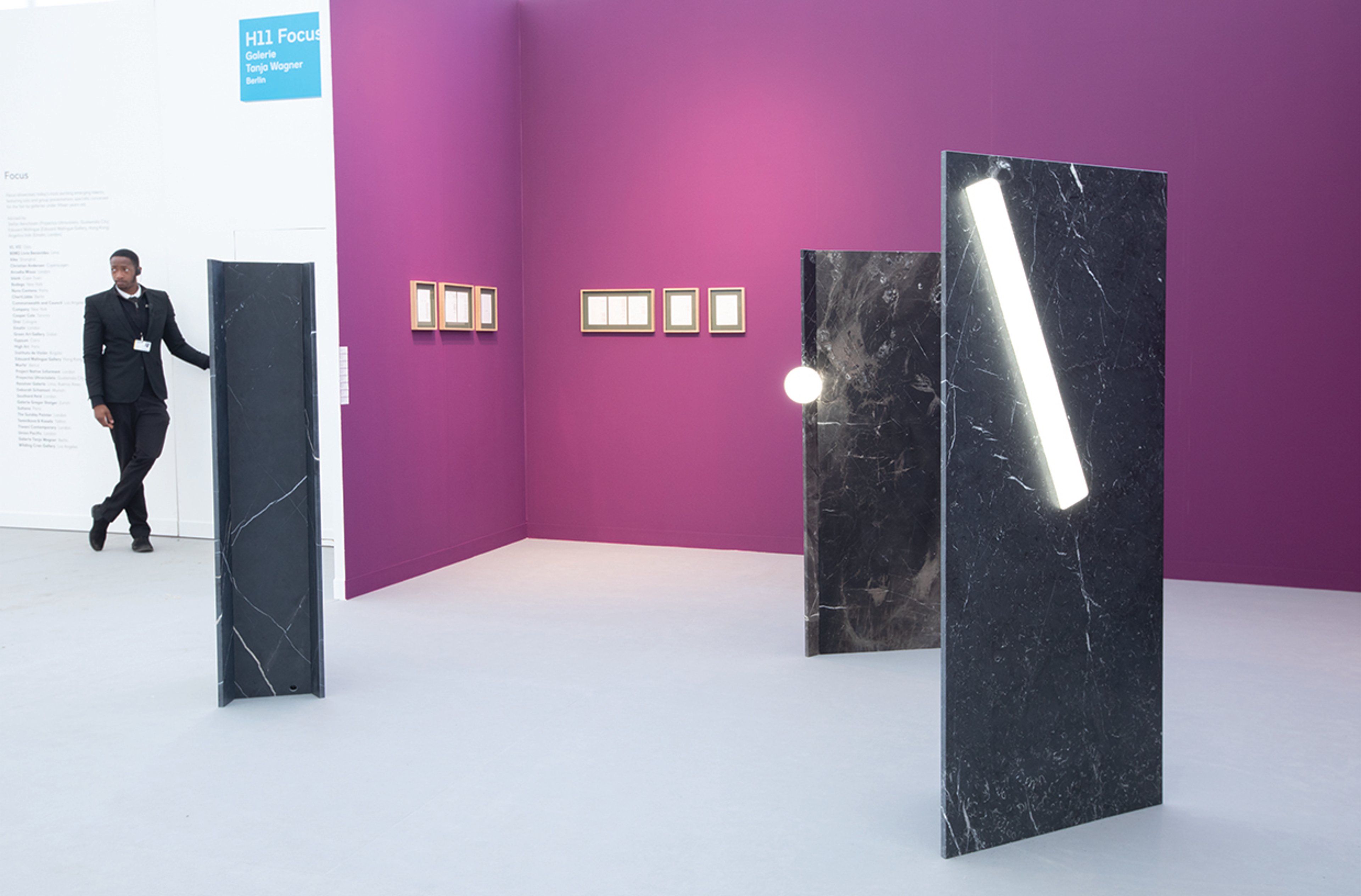 Kapwani Kiwanga, Galerie Tanja Wagner: This two-part installation evokes the historical surveillance of African American people and its legacies in the present. In her sculptures, Kapwani Kiwanga recalls “lantern laws” passed in New York in 1713 that forced black and First Nations slaves to carry candles after dark when not accompanied by a white person. Essentially abstract, the sculptures are at human height and made of evocative materials: black marble was historically used in depictions of slaves and the LED lights set into the stone suggest the lanterns. Around the sculptures are texts from the Negro Motorist Green Book from 1961, a guide to the—damningly few—safe spaces for African American travellers in Jim Crow-era America. David Owens