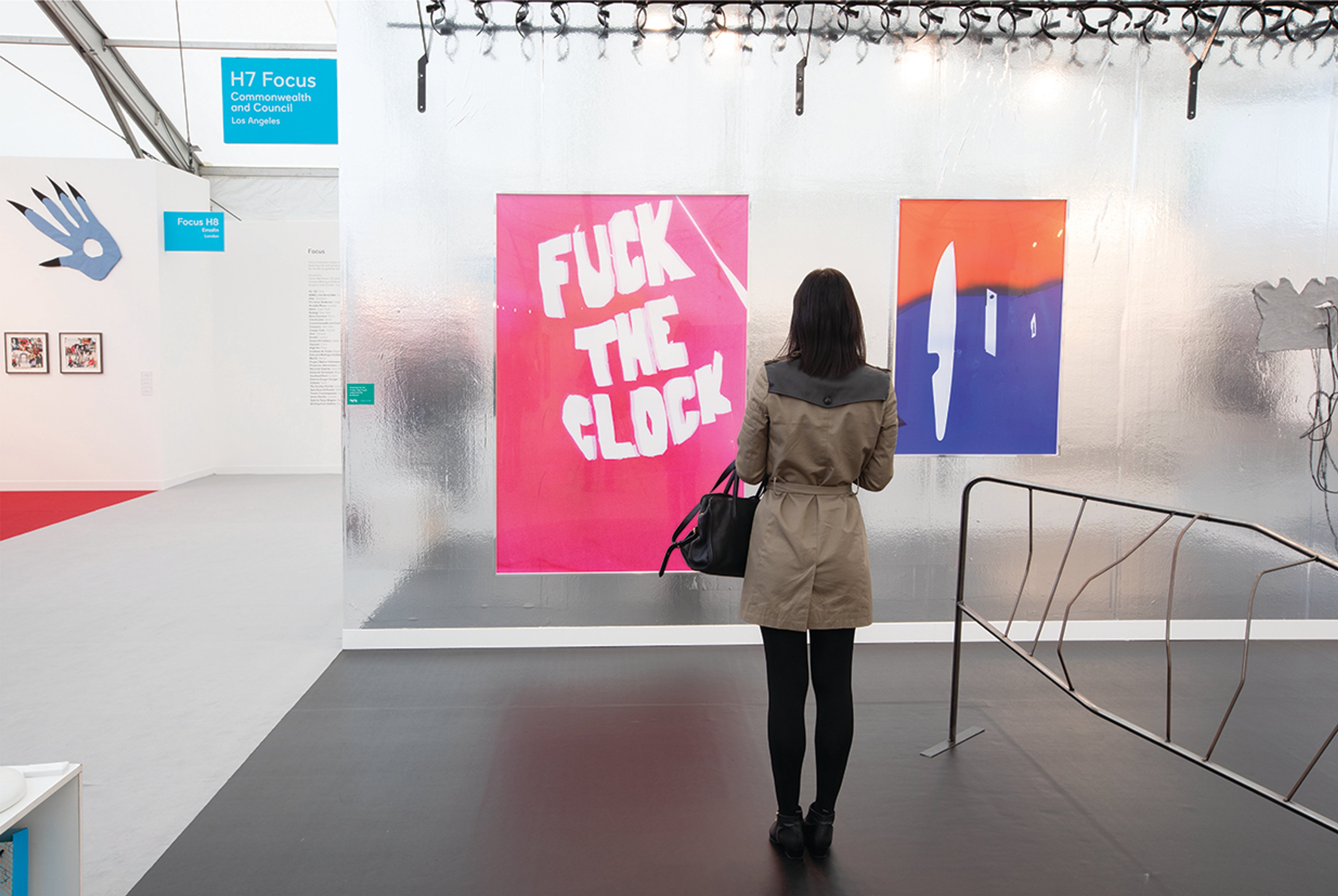 Nikita Gale and Patrick Staff, Commonwealth and Council: Patrick Staff, who is on the crest of a wave with a touring UK and Ireland show and another opening at the Serpentine Galleries next month, is showing prints and a sculpture at Frieze that reference The Prince of Homburg, a 19th-century play by Heinrich von Kleist. The prints, based on photograms and featuring silhouetted blades and a text simply saying “Fuck the Clock”, evoke the violence and exhaustion in the play and what the gallery calls “surreal states of queerness and transgression”. Meanwhile, Gale’s mangled steel barrier, sound cables protruding from the shiny silver walls and a photograph featuring microphones raise questions around freedom of expression in the context of surveillance. David Owens