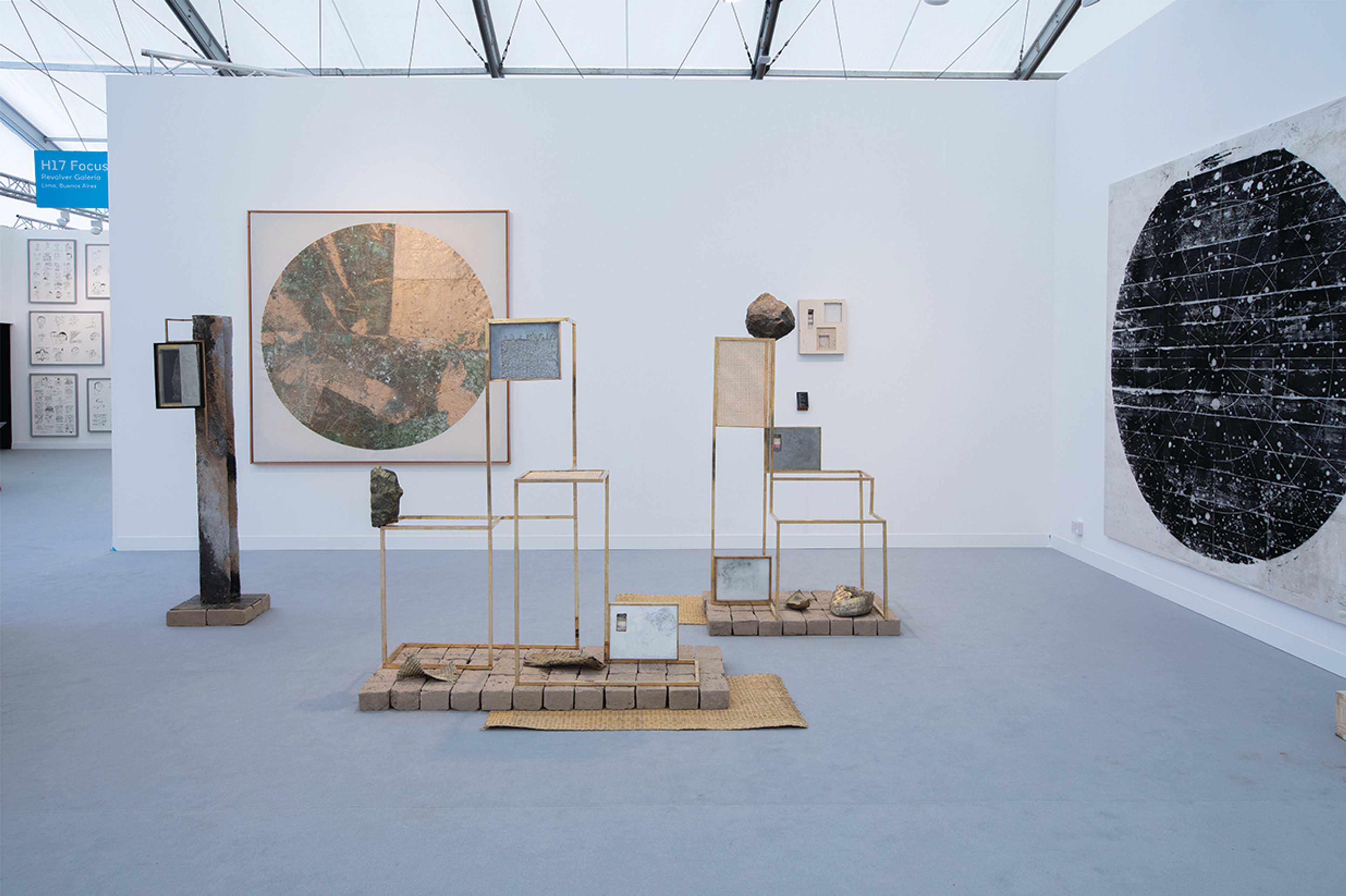 Ishmael Randall Weeks and Giancarlo Scaglia, Revolver Galeria: This is a stimulating juxtaposition of two Peruvian artists. Giancrlo Scaglia has spent time on the uninhabited Frontón Island, off Lima, once a prison and the site of a horrific massacre in the 1980s. Using frottage techniques, he took an imprint of walls scarred from shootings. He also left canvases with circles of gold paint, reflecting the sun back at itself and allowing seabirds’ guano to accrete on the surface. Ishmael Randall Weeks’s sculptures evoke the layering of cultural histories—elegant sculptural assemblages include elements of Modernist design, historical Peruvian objects and local geological materials. David Owens