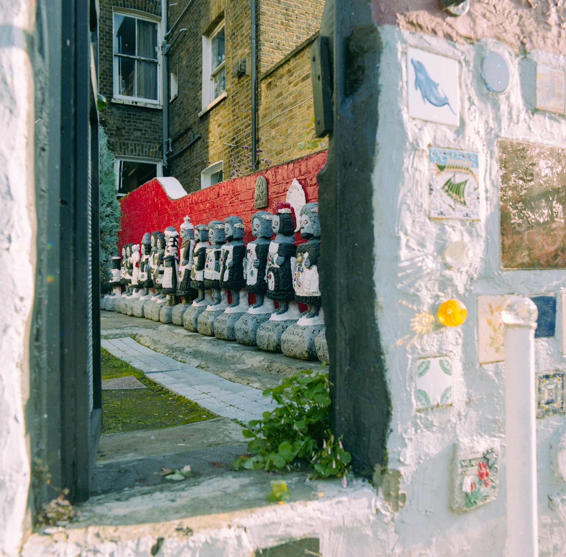It's a striking sight: in a small garden at the edge of the Grand Union Canal in west London stand rows of strange concrete figures studded with pieces of sparkling glass and costume jewellery.