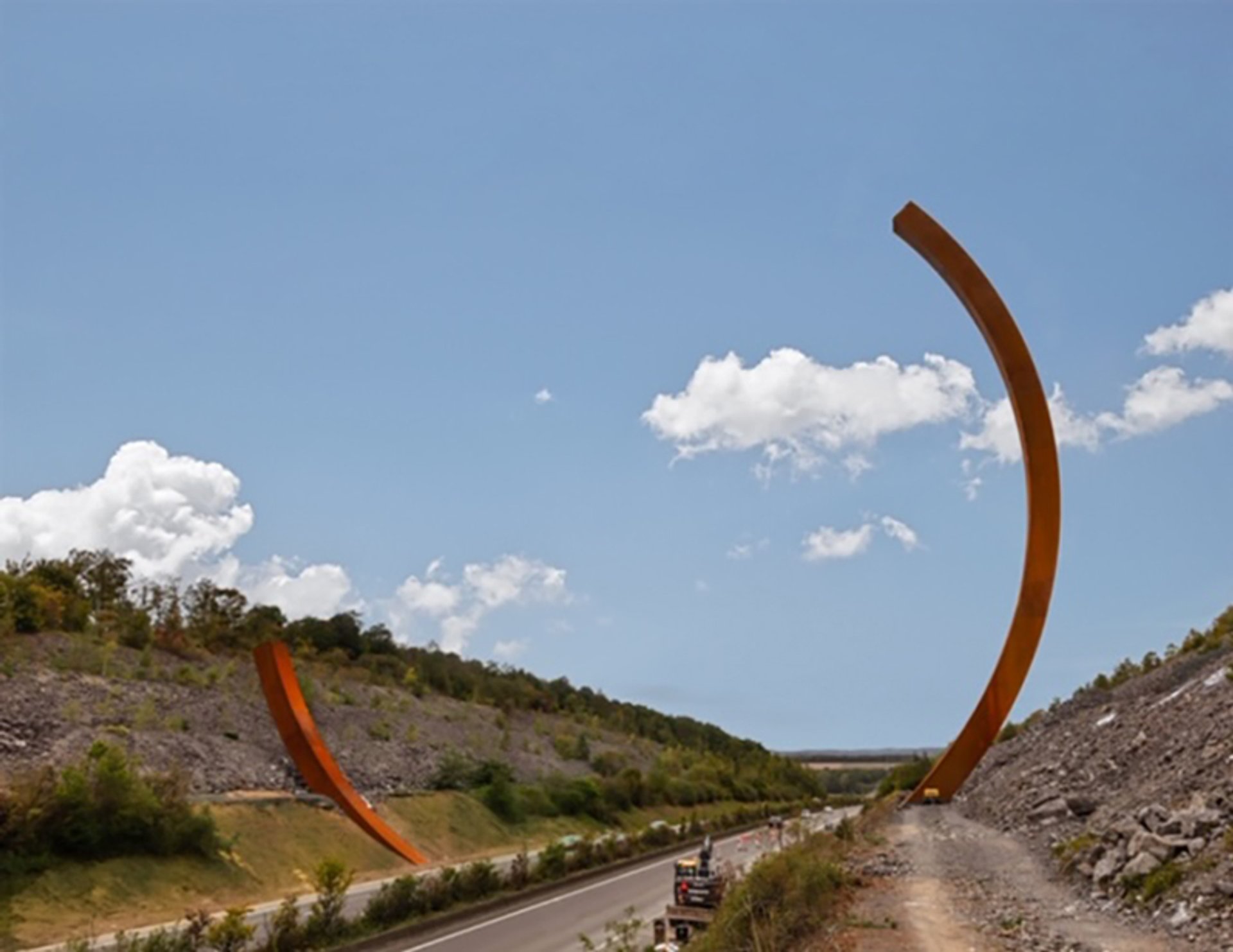 The 250-ton steel sculpture, called Arc Majeur, has been installed on either side of the E411 motorway in Lavaux-Sainte-Anne in Belgium between Namur and Luxembourg. Motorists are under the impression that they are driving through the all-encompassing sculptural arc.