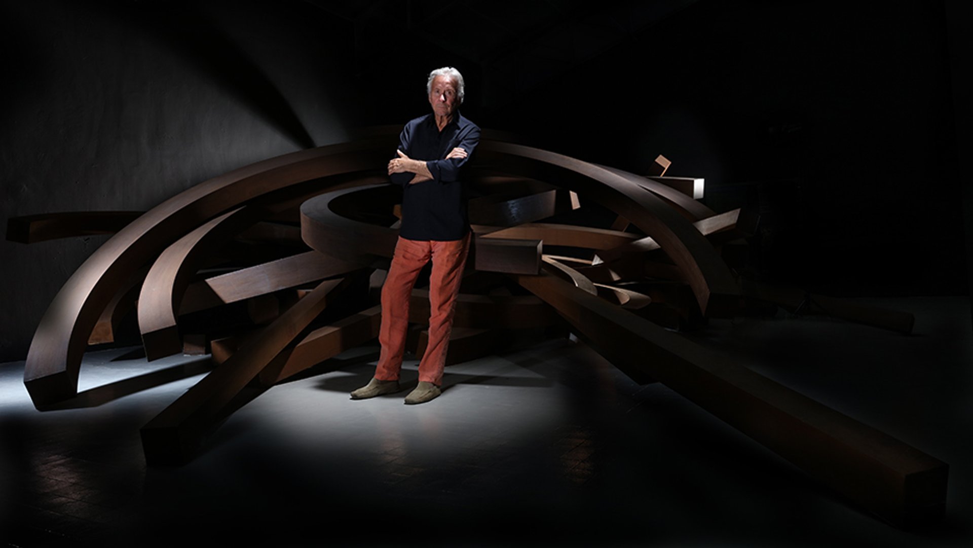 Bernar Venet with pieces of the unassembled Arc Majeur Image: courtesy of the artist