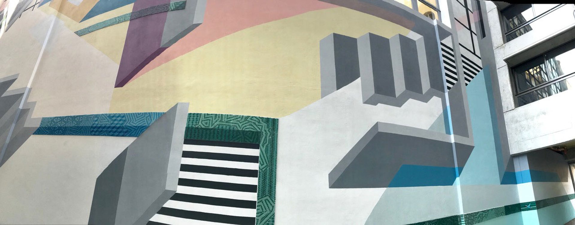 Commissioned by Ferruchi’s employer, the construction company Fundar, the paint and mosaic mural features a series of Escher-like stairwells that seem to be suspended in mid-air—at once appearing and disappearing into the surrounding architecture. An exquisitely drawn hummingbird made from Venetian glass tiles that can be found along a lower edge of the mural was inspired by his widow’s story of repeatedly being visited by a hummingbird after Ferruchi death.