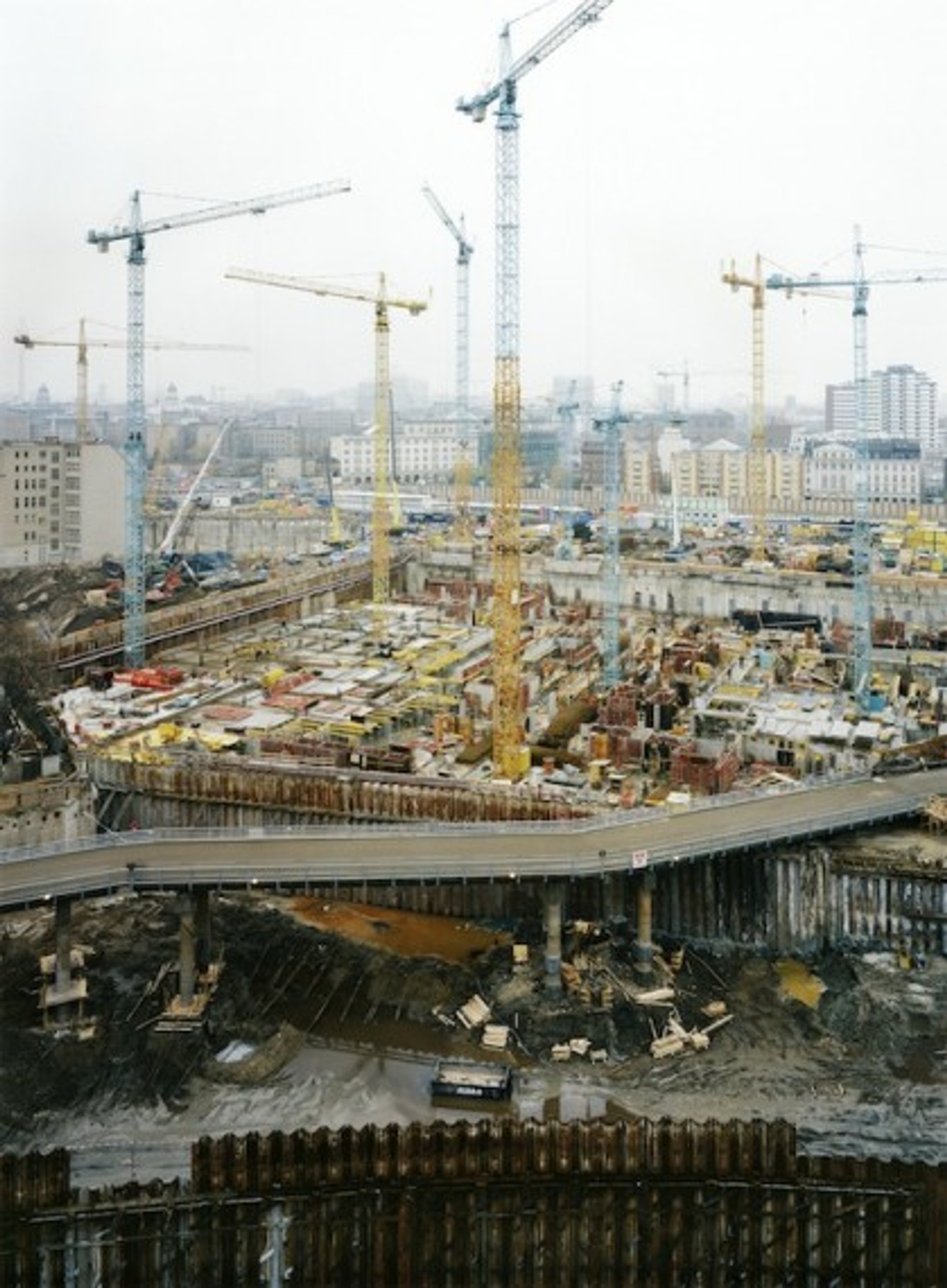 Berlin has been subject to constant transformation in the last quarter of a century. In an extensive project, the German artist Frank Thiel (b 1966) has photographed the city’s construction sites and its cranes, pipeworks, excavations and renovations since 1995. His large-scale photographs, such as Stadt 1/09 [Berlin], 1996, take stock of this mass transformation of a city, and by extension, of the destruction of large parts of the former East Berlin.