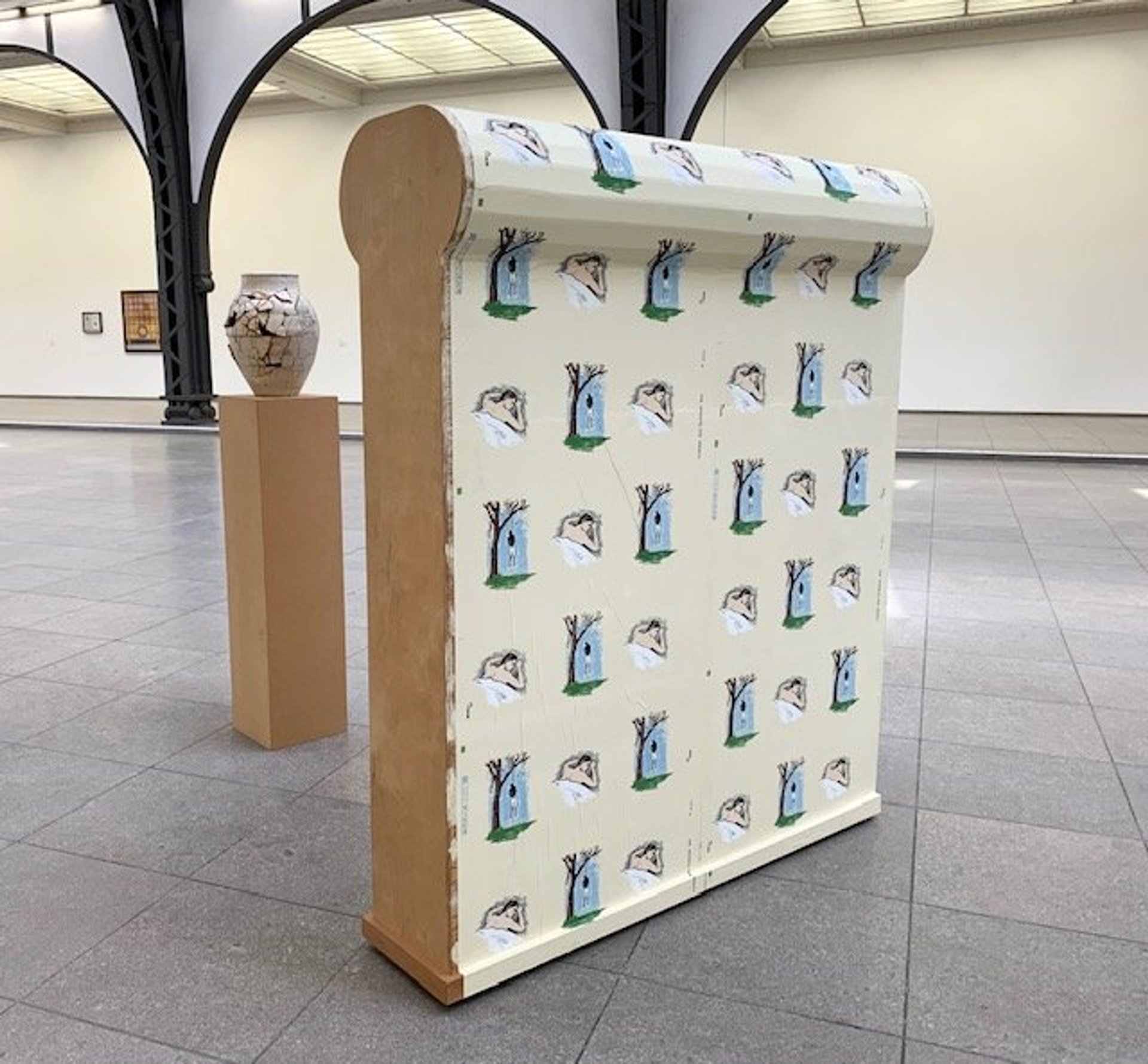 The master of warped appropriation Martin Kippenberger (1953-97), in typically contrarian mode, did not shy away from voicing his criticism of the dismantling of the Berlin Wall. In Put your Freedom in the Corner, Save it for a Rainy Day, 1990, the German artist created a scaled-down replica, in plywood, of a fragment of the Wall. He then covered it with wallpaper by the US artist Robert Gober, which depicts a lynched black man hanging from a tree and a white man sleeping. It stands besides a shattered vase crudely reassembled with glue. In Kippenberger’s explanation of the piece, he wrote: “Everybody cheered when the Wall was pulled down. That’s the wrong way to handle history.”