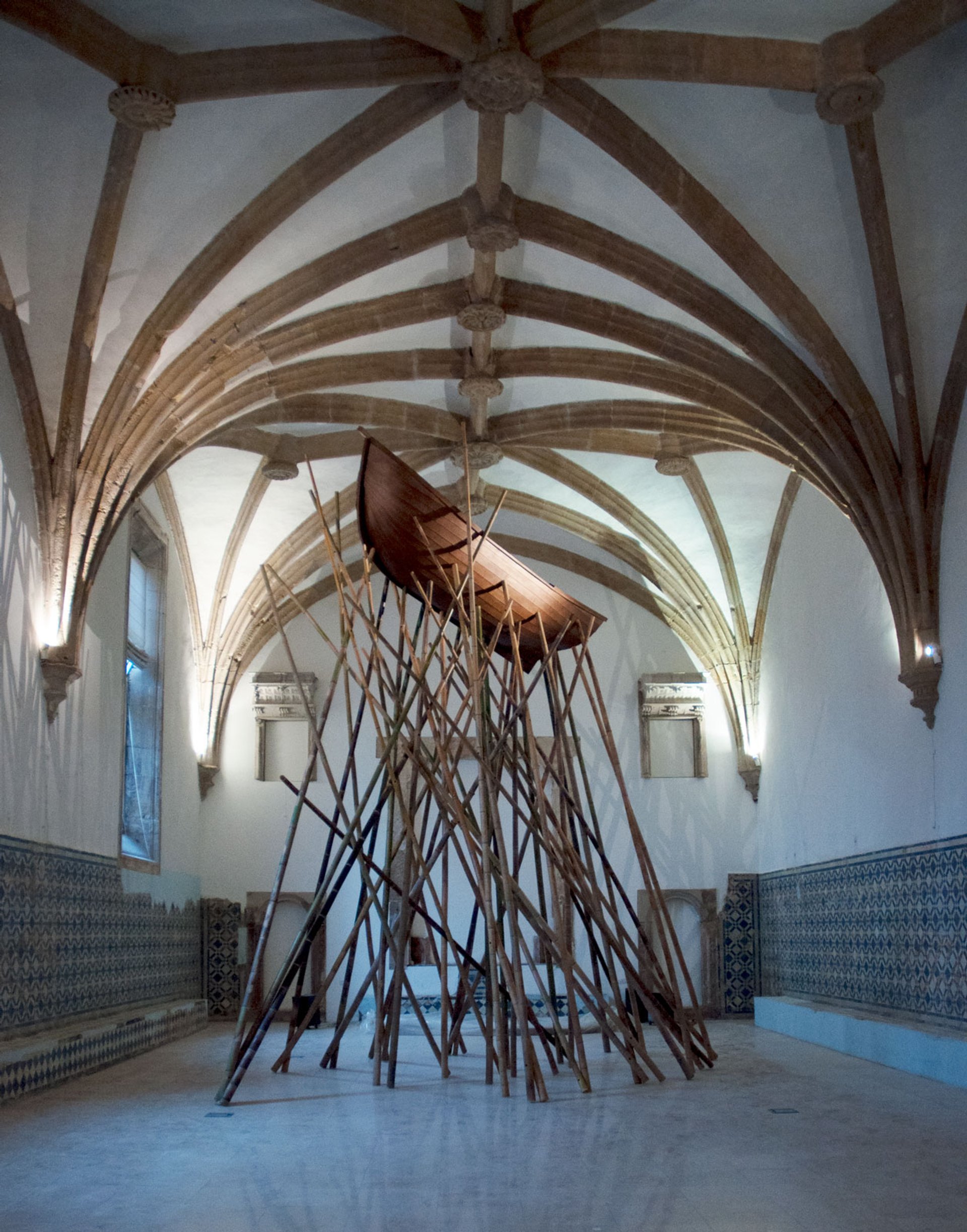 For the inaugural edition in 2015, a former refectory for the Santa Cruz Monastery was regenerated after the biennial invited the Portuguese artist to Pedro Cabrita Reis to rip apart its dated museological displays and make a temporary installation. Once the installation was dismantled, the space was returned to its former glory and this year houses Sonhos de outubro (2014–2019) by the Brazilian artist José Spaniol, which is an installation of a boat seemingly stranded after floodwaters have receded.