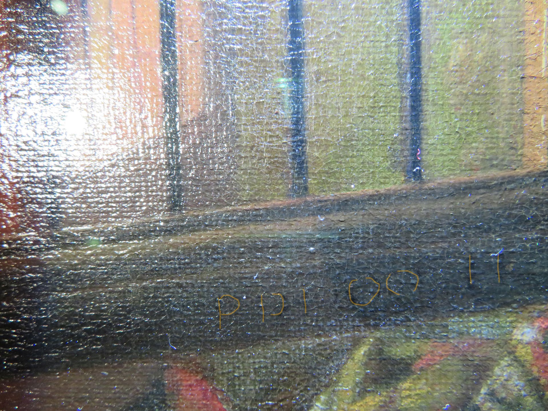 A detail of Woman weighing gold and silver Coins with a possible signature (strengthened)
