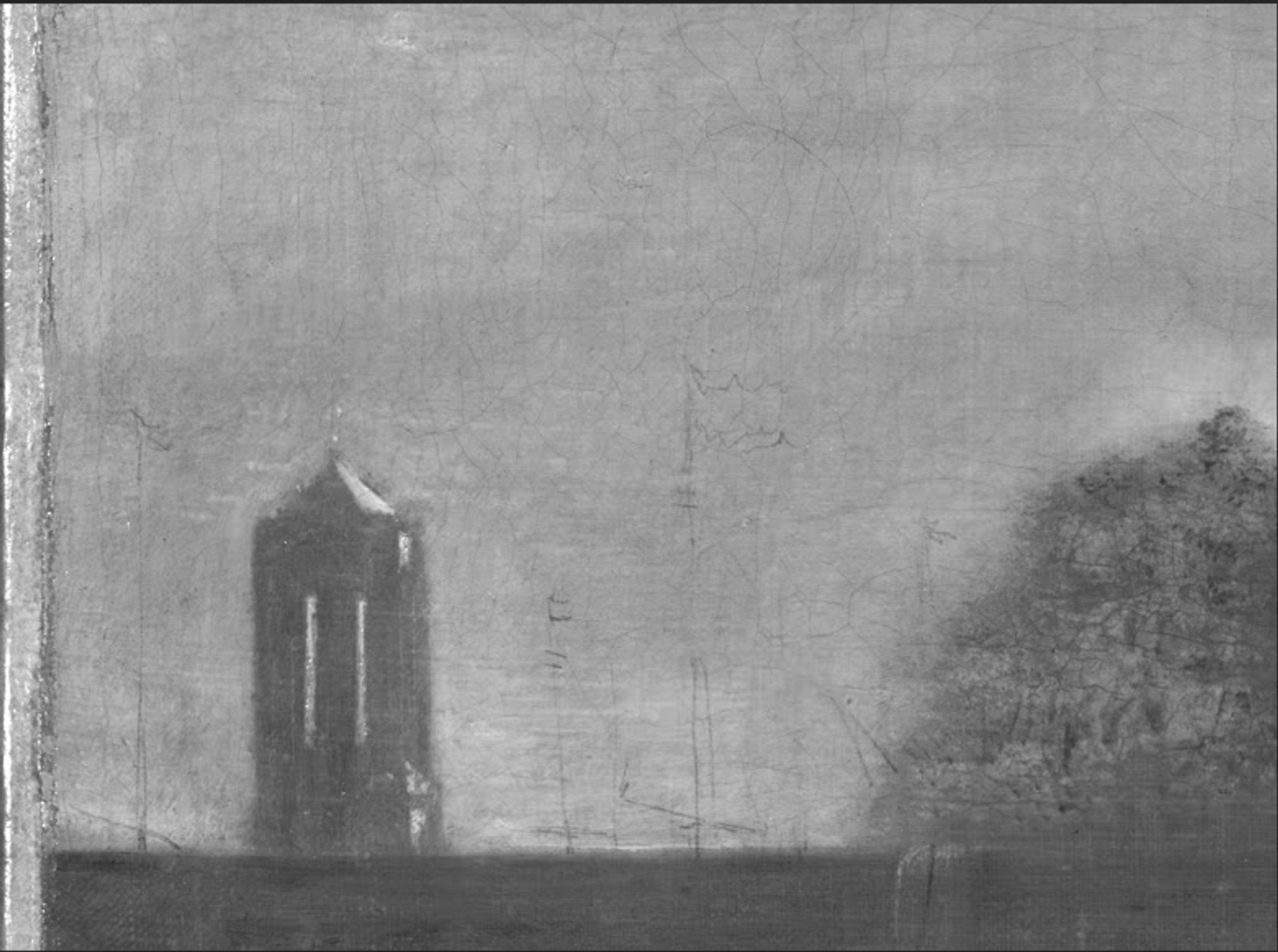 Infrared imaging has revealed an earlier painting of a ship’s masts in A Dutch Courtyard (National Gallery of Art, Washington, DC, around 1658-60). They appear in the upper left of the sky and are of rigged ships which would have been too large to sail into Delft in the 17th century, so this suggests that De Hooch may have reused the canvas intended for an earlier painting.
