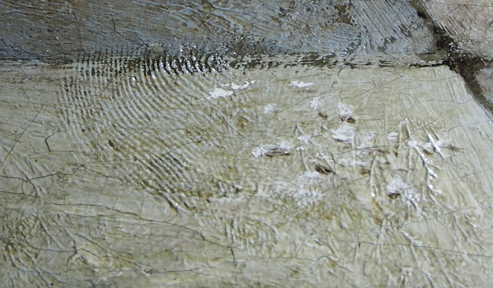 A detail of Pieter de Hooch's Cardplayers in a sunlit Room showing the thumbprint