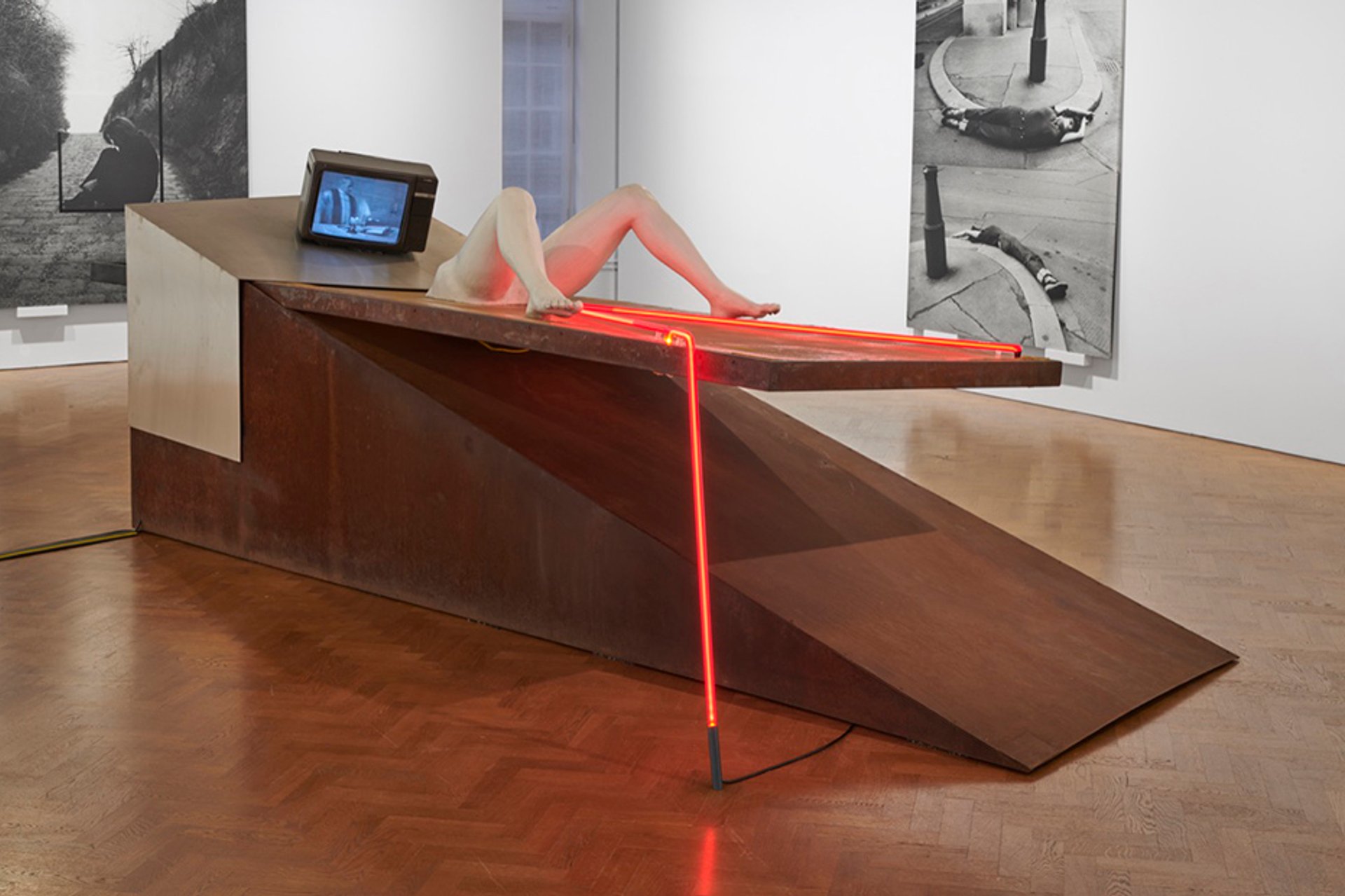 The sculpture—consisting of a pair of women’s legs mounted on a rusted steel bed with a stream of red neon running from between them—was startling enough for its unabashed depiction of childbirth or menstruation, but it was also shown with a looped video of a Catholic priest saying mass.