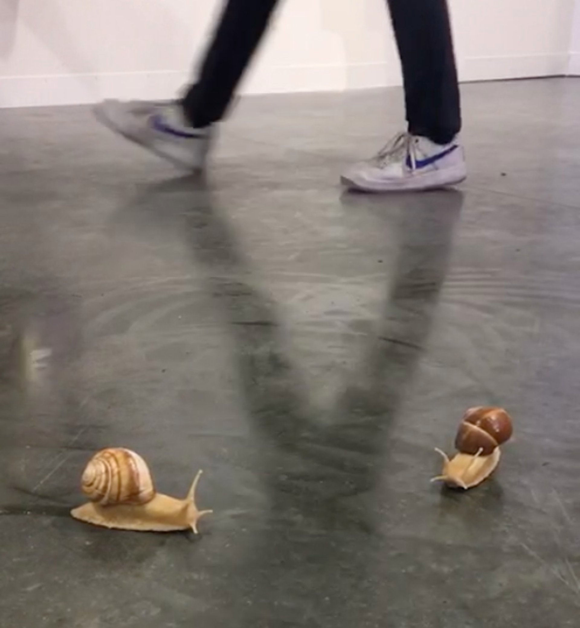 “How do you control them?” a perplexed woman asked, confronted by the two meaty snails slithering across the floor of Modern Institute Glasgow’s stand at Art Basel in Miami Beach. “I’m the trainer,” joked Ric Warren, the gallery’s technical manager, explaining that the oozing molluscs were actually mechanical creations by the artist Urs Fischer, called Maybe (2019). Tiny wheels and a motor were hidden inside the shell, as well as a container of gum arabic dissolved in ethanol that produces the ever-so-lifelike slime. Imagine the pranks you can get up to with these creepy-crawlies that come with an adjustable meandering circumference, rechargeable batteries—and a $125,000 price tag for the pair.