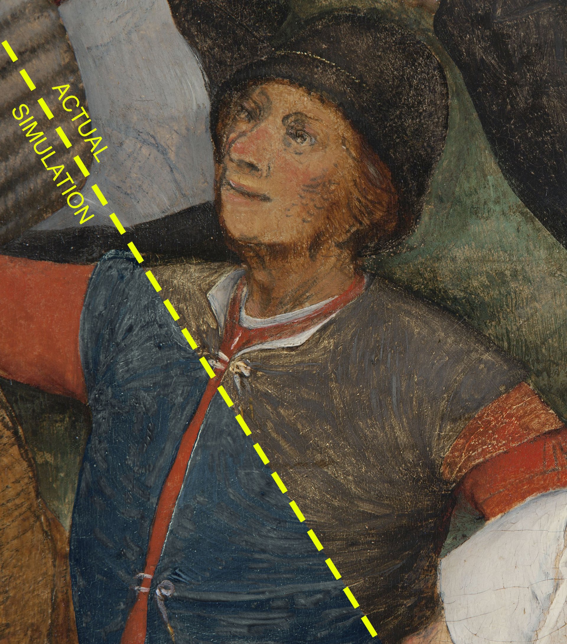 While Bruegel seems to have stuck with his general composition of the scene, he makes frequent adjustments to the positioning of hands, legs, feet and hems of the dancing peasants. Superimposing the underdrawing over the finished painting also reveal changes in some of the faces.