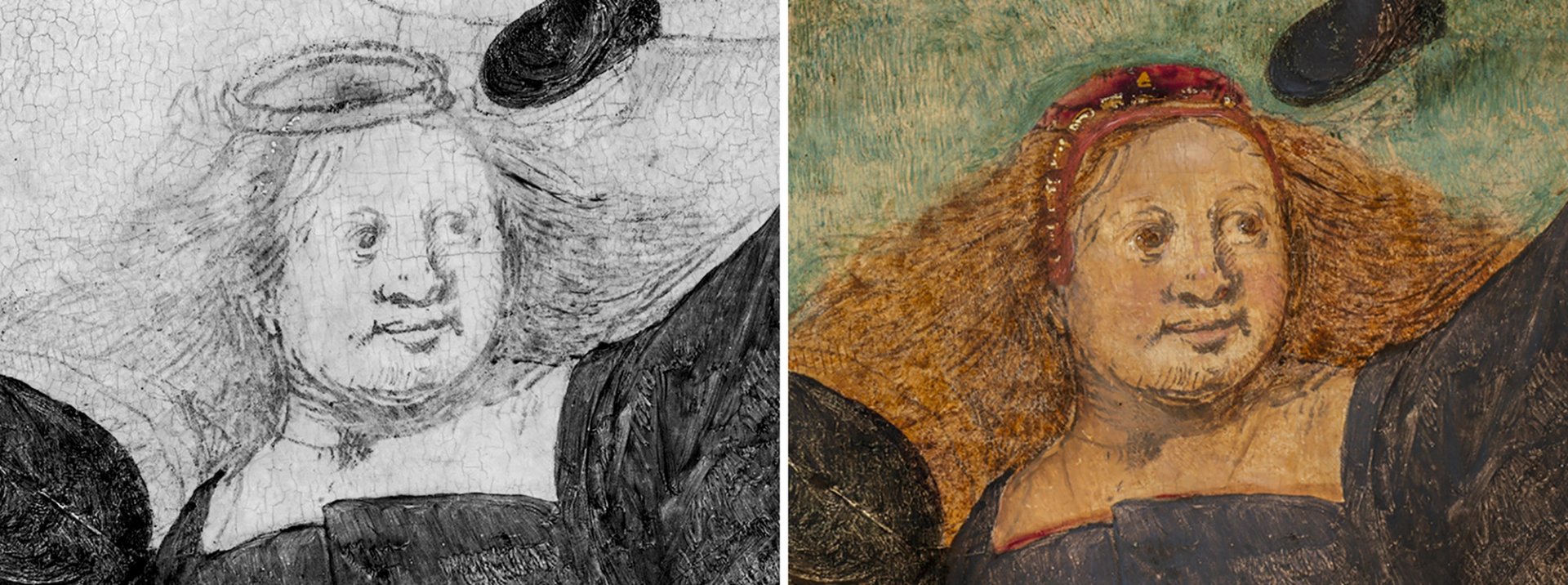 Bruegel sketched the bride in The Wedding Dance with a crown in his underdrawing, left, but with a headband in the finished painting Detroit Institute of Arts