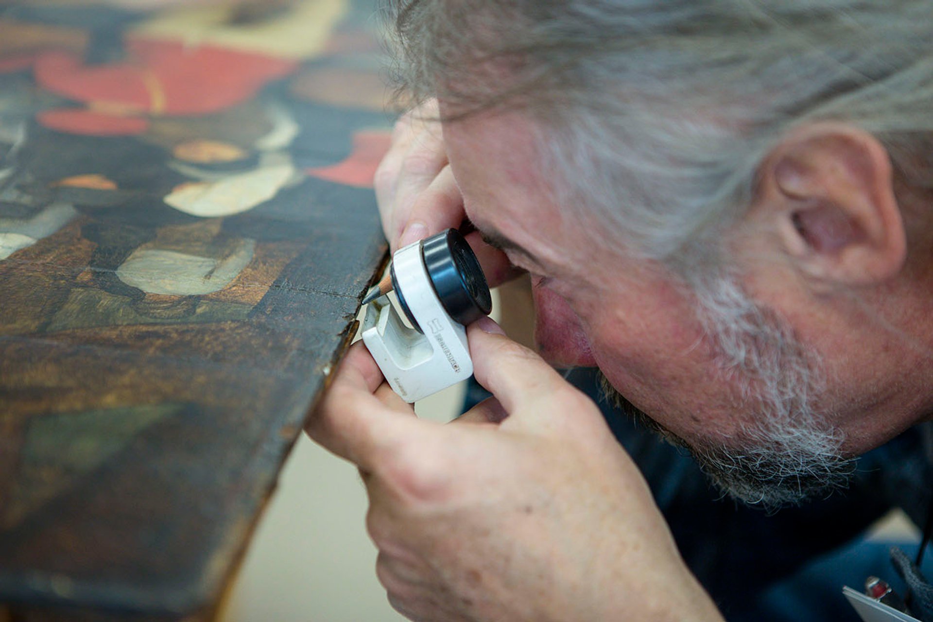 An expert, Tomasz Wazny, assesses the edge of The Wedding Dance's wood panel as part of a dendrochronological analysis Detroit Institute of Arts