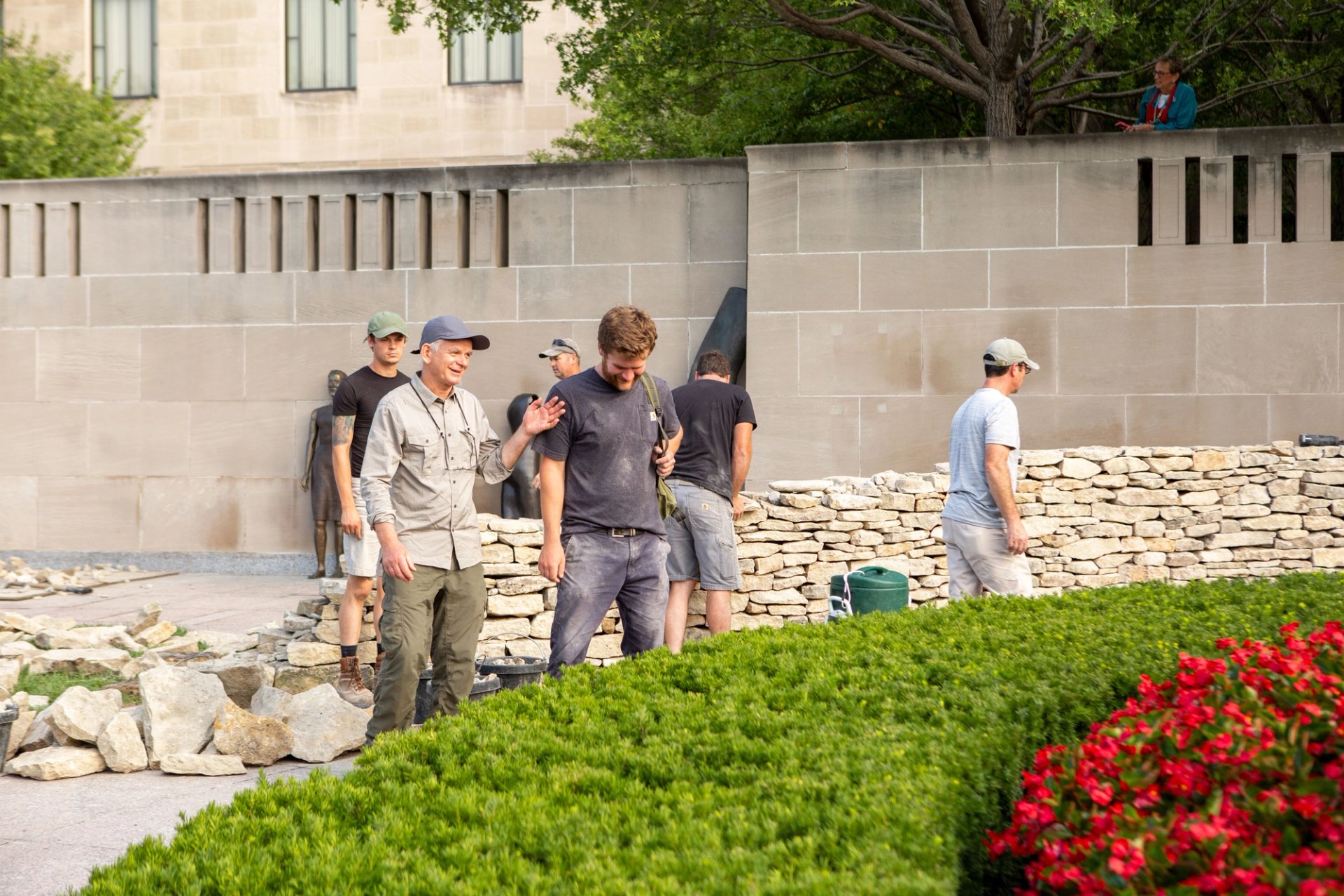 The artist Andy Goldsworthy and his team working on Walking Wall during Phase 4, the week of 9 September 2019 Photo: ©2019 The Nelson Gallery Foundation