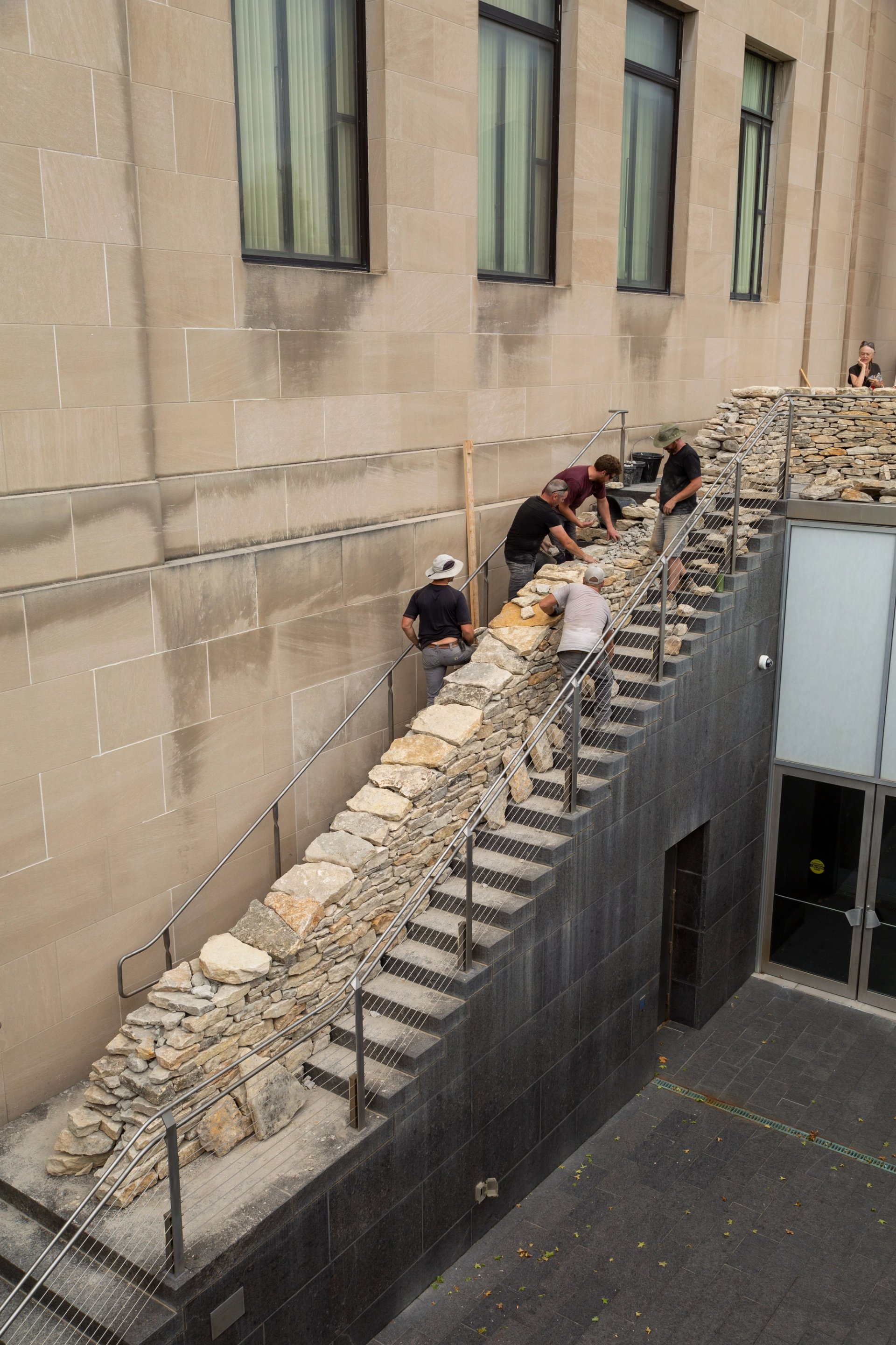 At a celebratory event for patrons of the Kansas City museum, as the final segment of the wall was taking shape within the glowing glass skin of the Steven Holl-designed Bloch Building, Goldsworthy pulled a behind-the-scenes stunt. As he spoke on stage, his crew of limestone stackers arranged a four-foot-tall wall that closed off a main corridor so Goldsworthy could soon take photos of delighted and bemused visitors.
