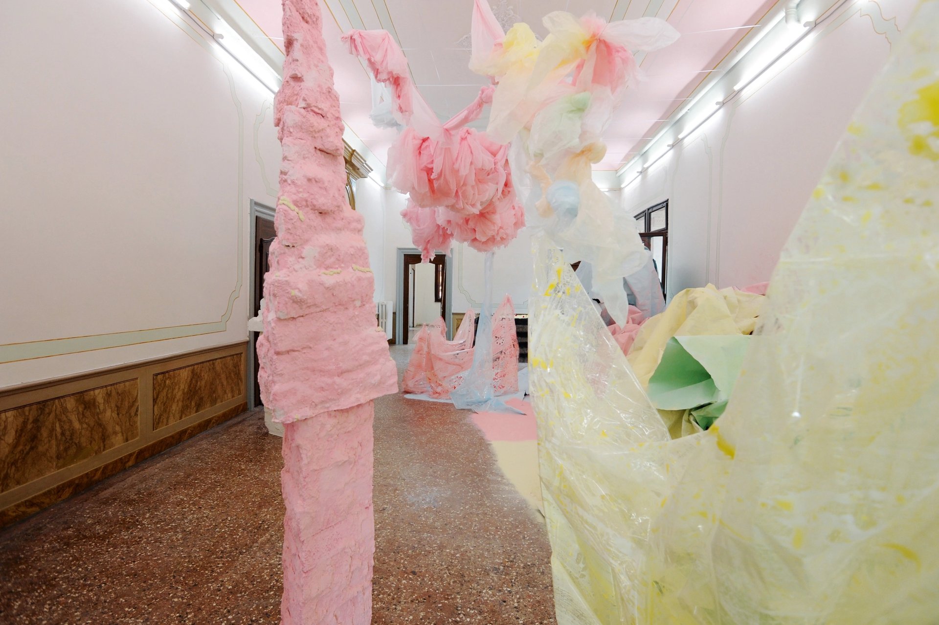 An installation view of Karla Black's Scotland + Venice commission at the Palazzo Pisani in Venice (2011), organised by the Fruitmarket Gallery Courtesy the artist and Galerie Gisela Capitain, Cologne Photograph Gautier Deblonde