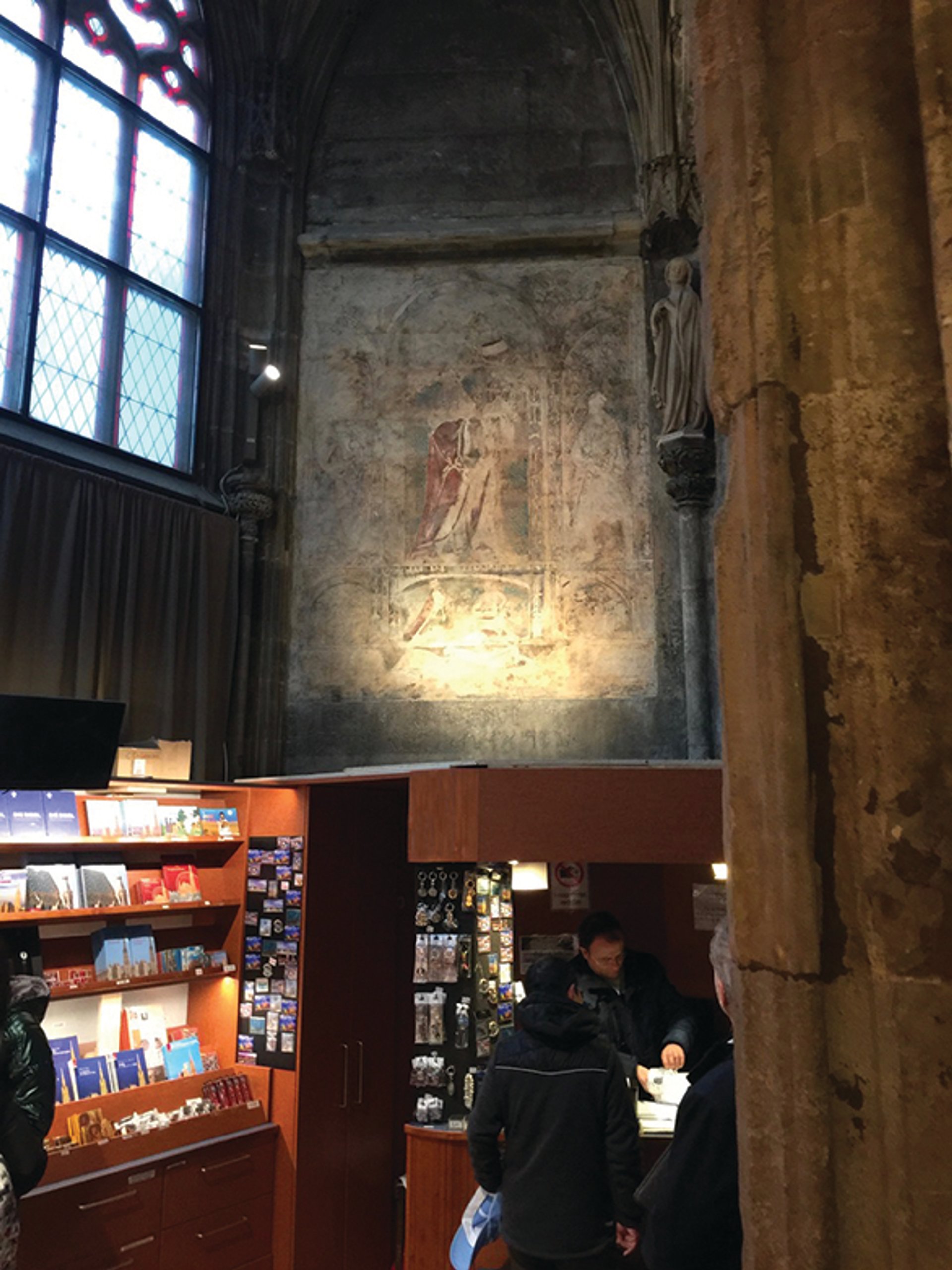The wall painting, a two-dimensional representation of a triptych altarpiece, was discovered above the shop in St Stephen’s Cathedral © Pedro Szekely