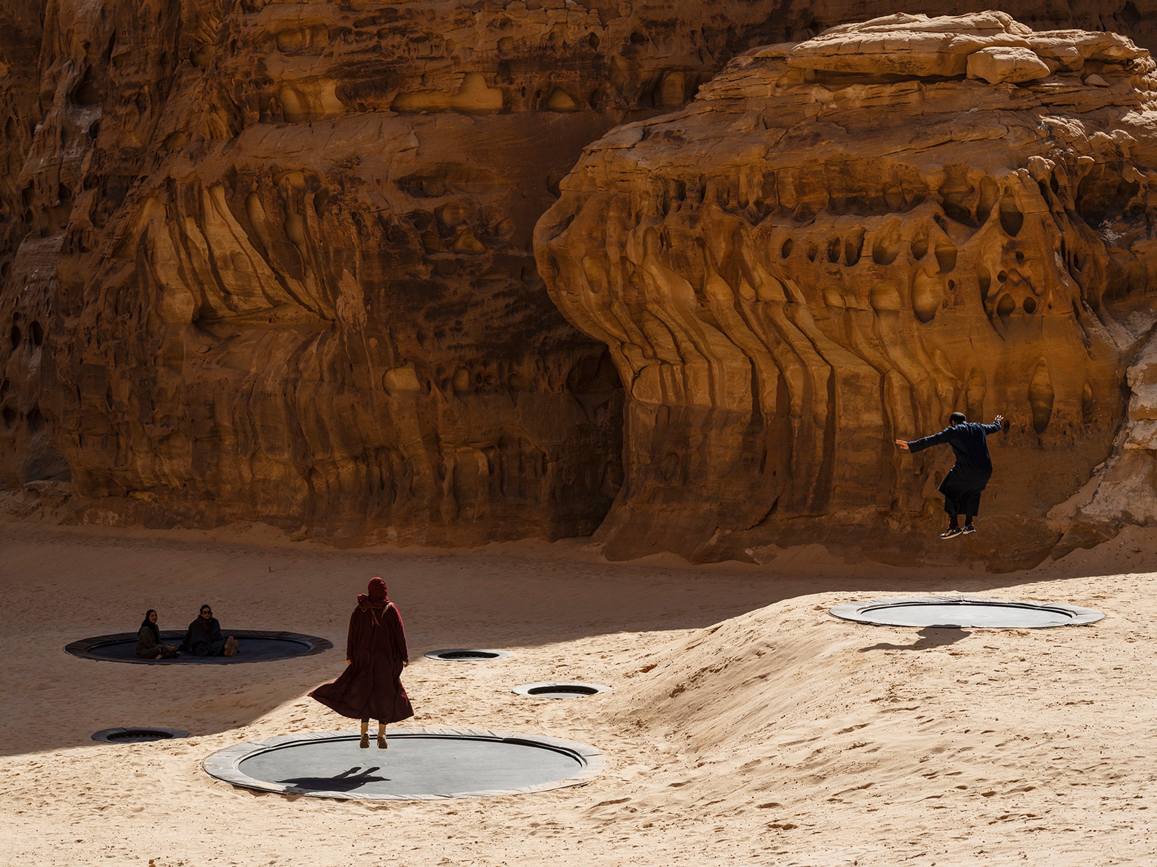 Participants include Zarah Al Ghamdi and Nasser Al Salem of Saudi Arabia, Egyptian-born Wael Shawky, the Danish collective Superflex, and the Dubai-based artist eL Seed. Known for his contemporary Arabic calligraphy, eL Seed draws on AlUla’s key position on the “incense trade route”, which connected Asia, Africa and Europe, bringing spices and silk overland. “The scale of the work is crazy. It’s all about humility, the landscape makes me feel like a spot in the universe. I tried to avoid competing with the environment and wanted the work to blend in,” eL Seed says.
