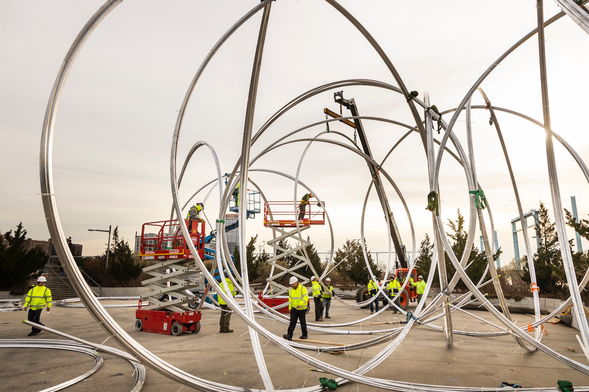 The British sculptor Antony Gormley has produced a towering work in Brooklyn that conceptually evokes “the phenomena of human connection”, he says, during a time when political and ideological odds between humans have caused “an absolute fucking disaster”. The monumental work New York Clearing (2020)—a “drawing in space”, as the artist describes it, involving more than 18 kilometers of coiled aluminum tubing that rise to a height of more than 15 meters—was unveiled today at Pier 3 in Brooklyn Bridge Park and remains on public view until 27 March.