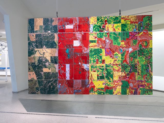 Climate change emerges as a theme in the exhibition. The show documents how the thawing of permafrost in central Siberia is releasing ever greater amounts of methane, for example, with potentially dire consequences for global temperatures. Therrien notes that a pair of father-son geneticists are fancifully researching the resurrection of the prehistoric mammoth with the notion that it could tromp on the permafrost and keep the methane tamped down. Food security is a pressing theme as well, with displays like the tomato-growing module outside the museum and photographs of Dutch farmers toiling by night in greenhouses suffused with pink light to assure optimal growing conditions for food exported across the world. (The presentations have their quixotic moments, such as the display of a hydraulic system kit that could be strapped to the body of an ageing farmer to help him more easily bend and rise in the fields.)