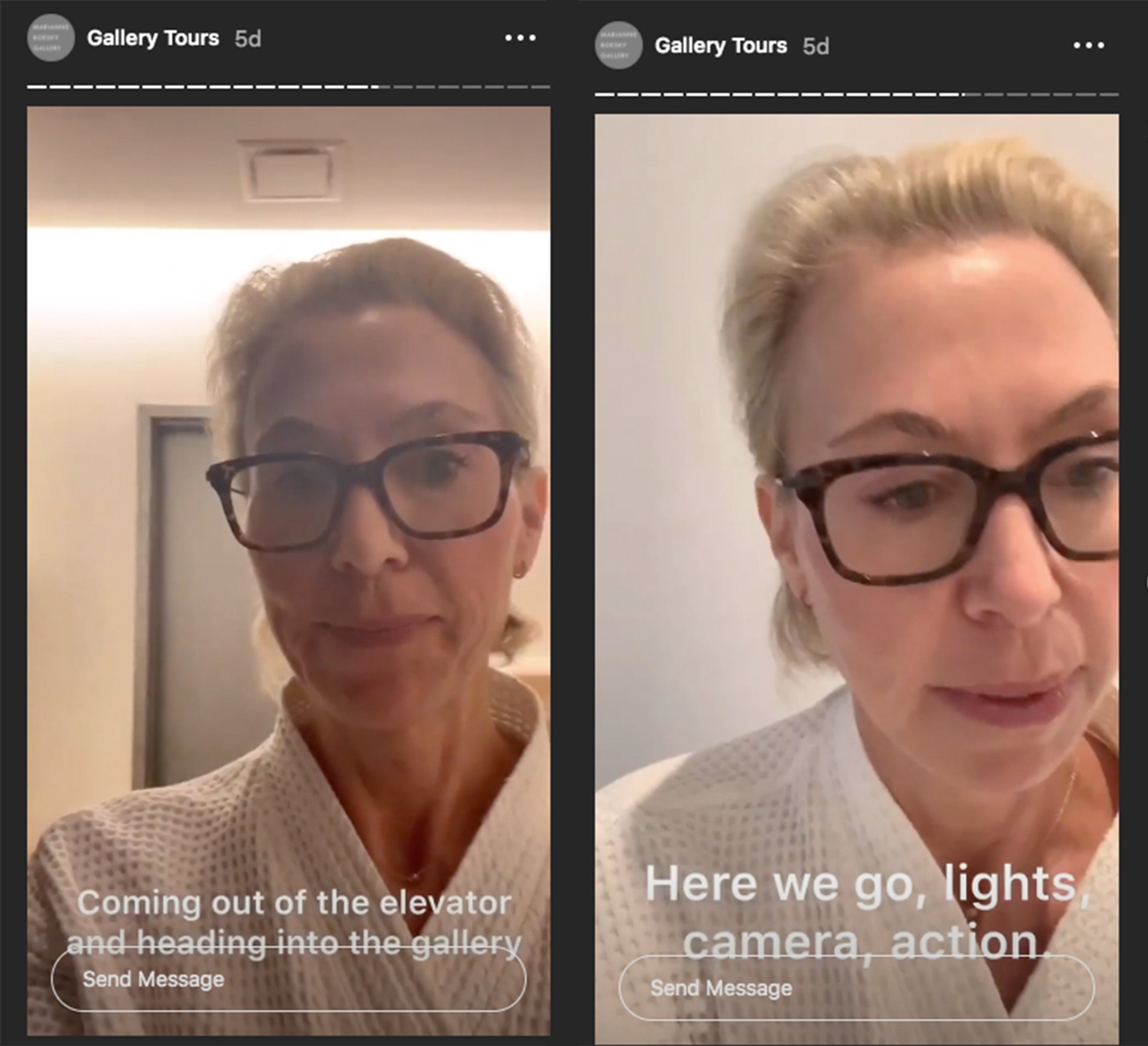 Marianne Boesky has taken to giving near daily Instagram tours of work in the gallery, which she lives above, in her bathrobe while on lockdown in New York Courtesy of Marianne Boesky via Instagram