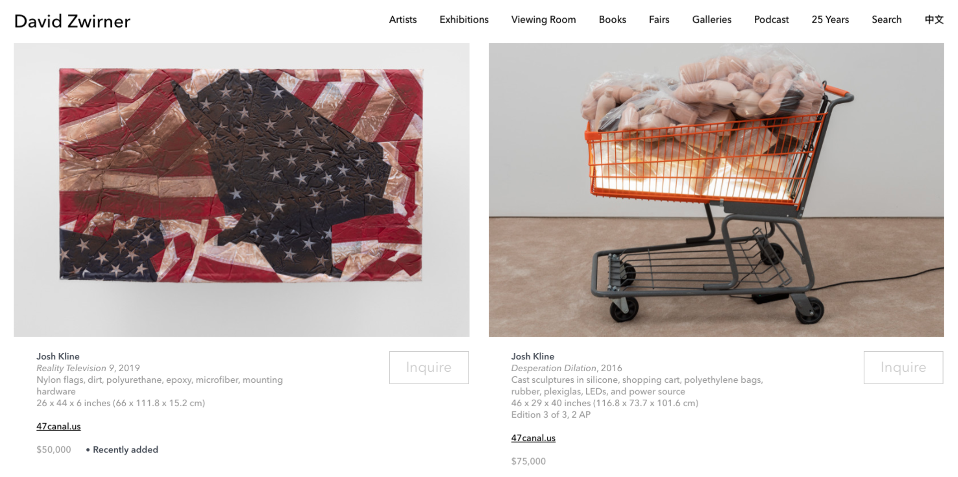 Works by Josh Kline featured by 47 Canal on David Zwirner's viewing room. Via David Zwirner