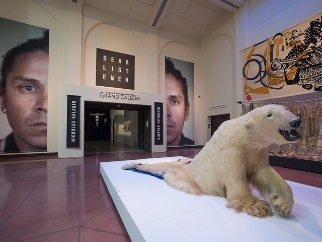 The Anchorage Museum exhibition is presented as a continuous scroll of text, photographs, videos, sculptures, paintings and even audio recordings of auctioneers offering sacred and often looted Indigenous objects like Hopi kachina dolls, which resounds powerfully as viewers peruse the exhibition. It begins with a collection of photographs titled Fair Warning: A Sacred Place, in which Galanin captured empty vitrines made to hold Indigenous art and objects at the Natural History Museum in New York. The work echoes the “ongoing relationship that indigenous people have with institutions, which often offer our only opportunity to visit our objects”, he says.
