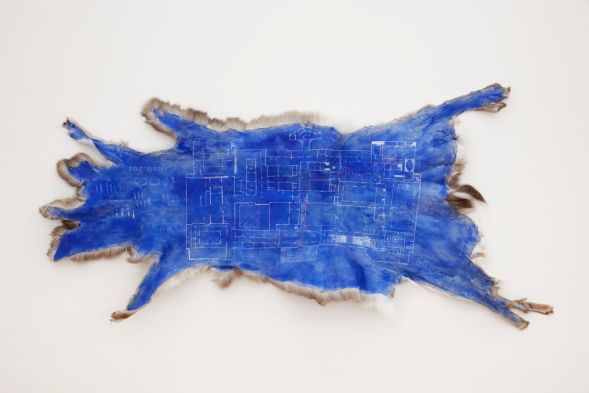 The empty cases “were created specifically to house our ceremonial objects but have been taken completely out-of-context for this colonial mechanism of consuming culture, which has been responsible for the romanticism of our community and for upholding the idea of underlying white supremacy and anthropology”. The collection of stark photographs also aims to envision a possible future where these missing objects can exist outside of institutional spaces built on colonial power. The series of works in the section Architecture of Return, Escape comprises a series of drawings on deer hide that map out several “escape plans” for Indigenous objects using the architectural blueprint of the Metropolitan Museum of Art.
