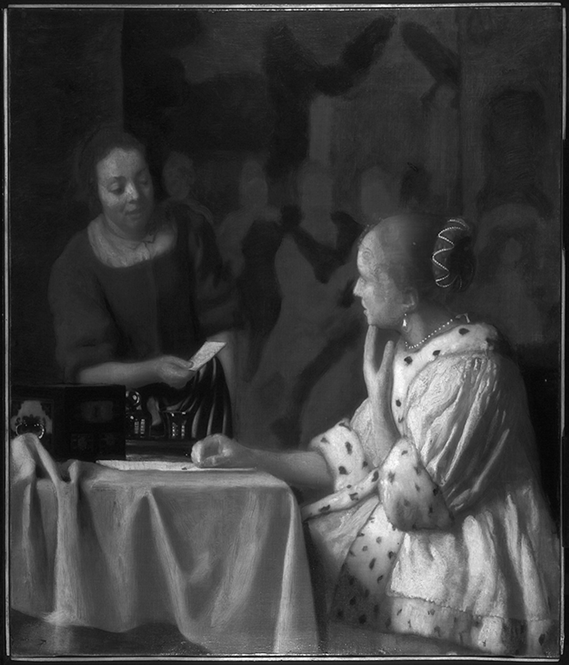 An infrared reflectogram indicating the first idea for the background of Mistress and Maid Evan Read, Paintings Conservation, the Metropolitan Museum of Art