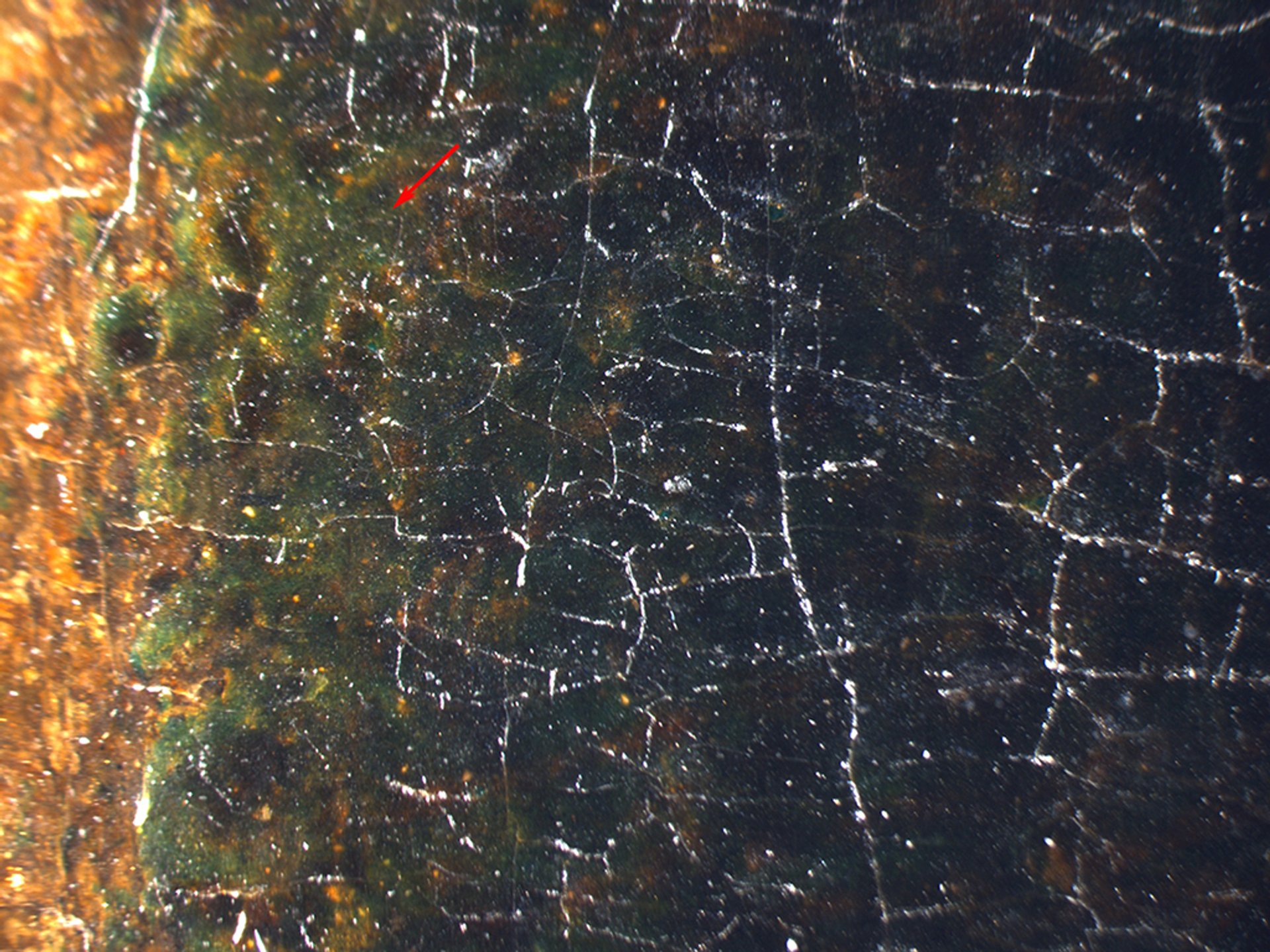 A photomicrograph taken in the left perimeter of the tablecloth. A red arrow indicates a small area of green that was preserved, possibly because it was protected from light by the painting's frame. Dorothy Mahon, Paintings Conservation, the Metropolitan Museum of Art