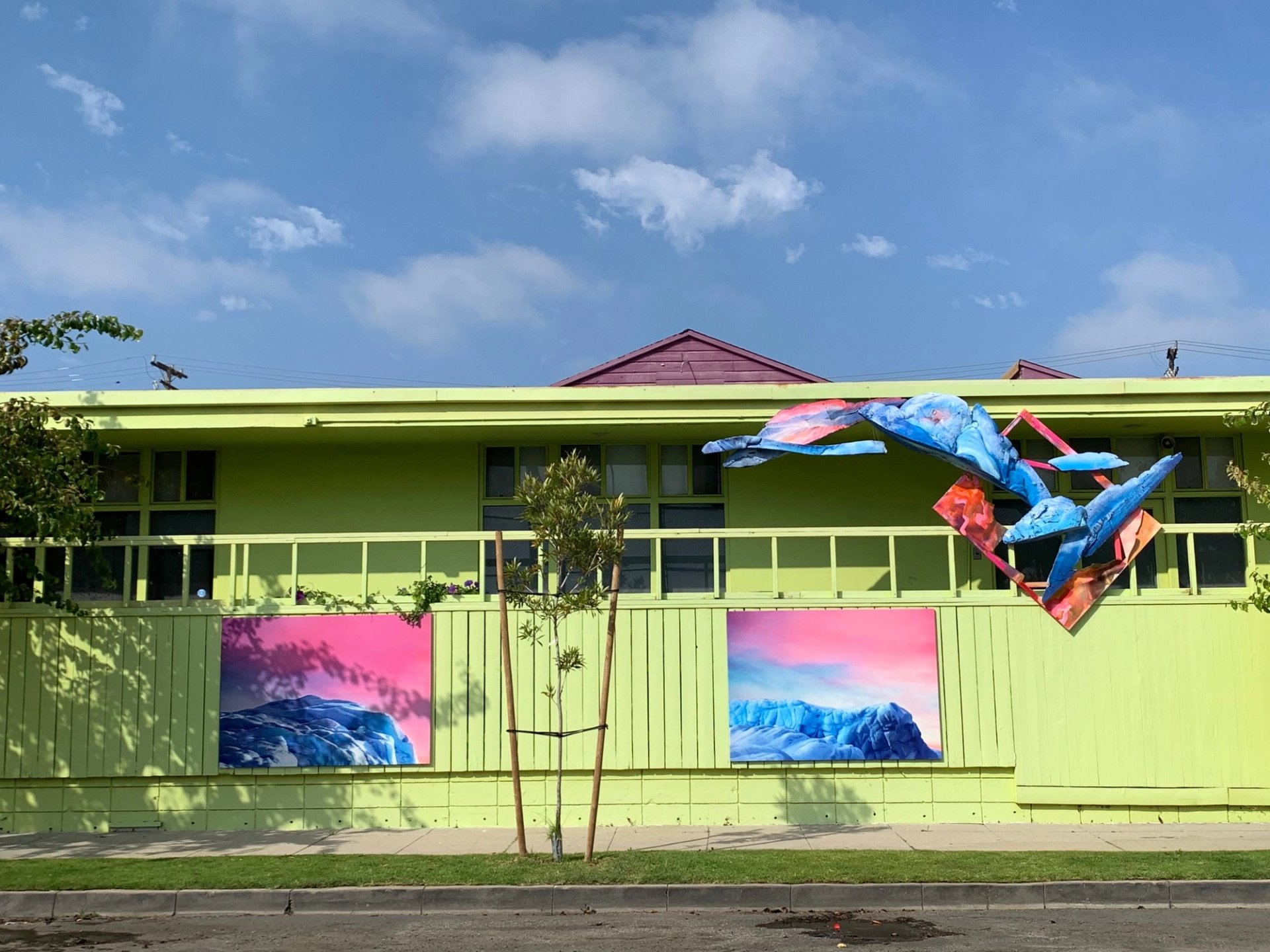 Luciana Abait, Peaks (2020), and Yvette Gellis, Sacred Spaces (2020), installed on the Lime Green Building in LA Courtesy of the artists