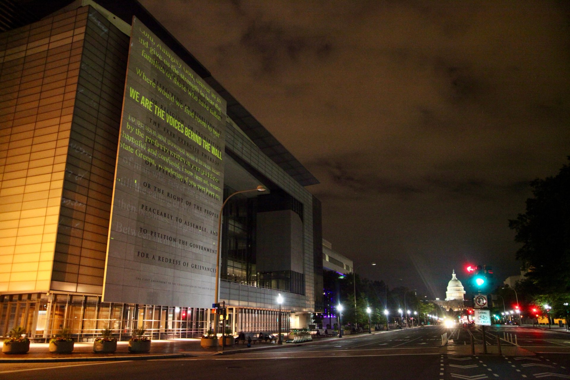 Following a police response, Thomas's guerilla installation was moved to the Newseum building. Courtesy of the Incarcerations Nations Network