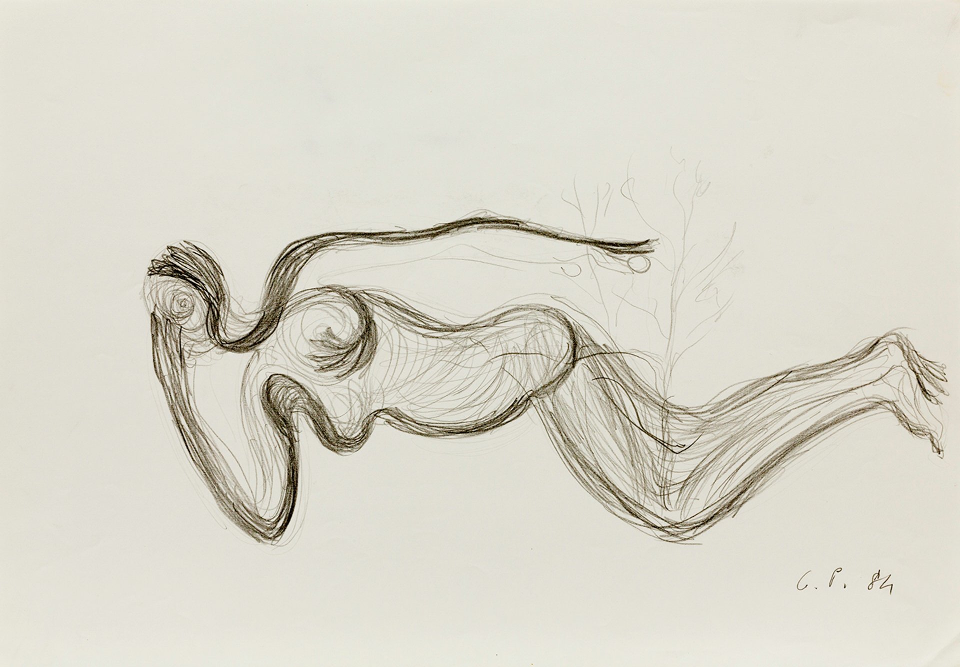 An untitled 1984 work by Giuseppe Penone in graphite on paper, evoking his "vegetal gestures" in bronze inspired by a French Romanesque sculpture of Eve made for the Cathedral of Autun © Archivio Penone