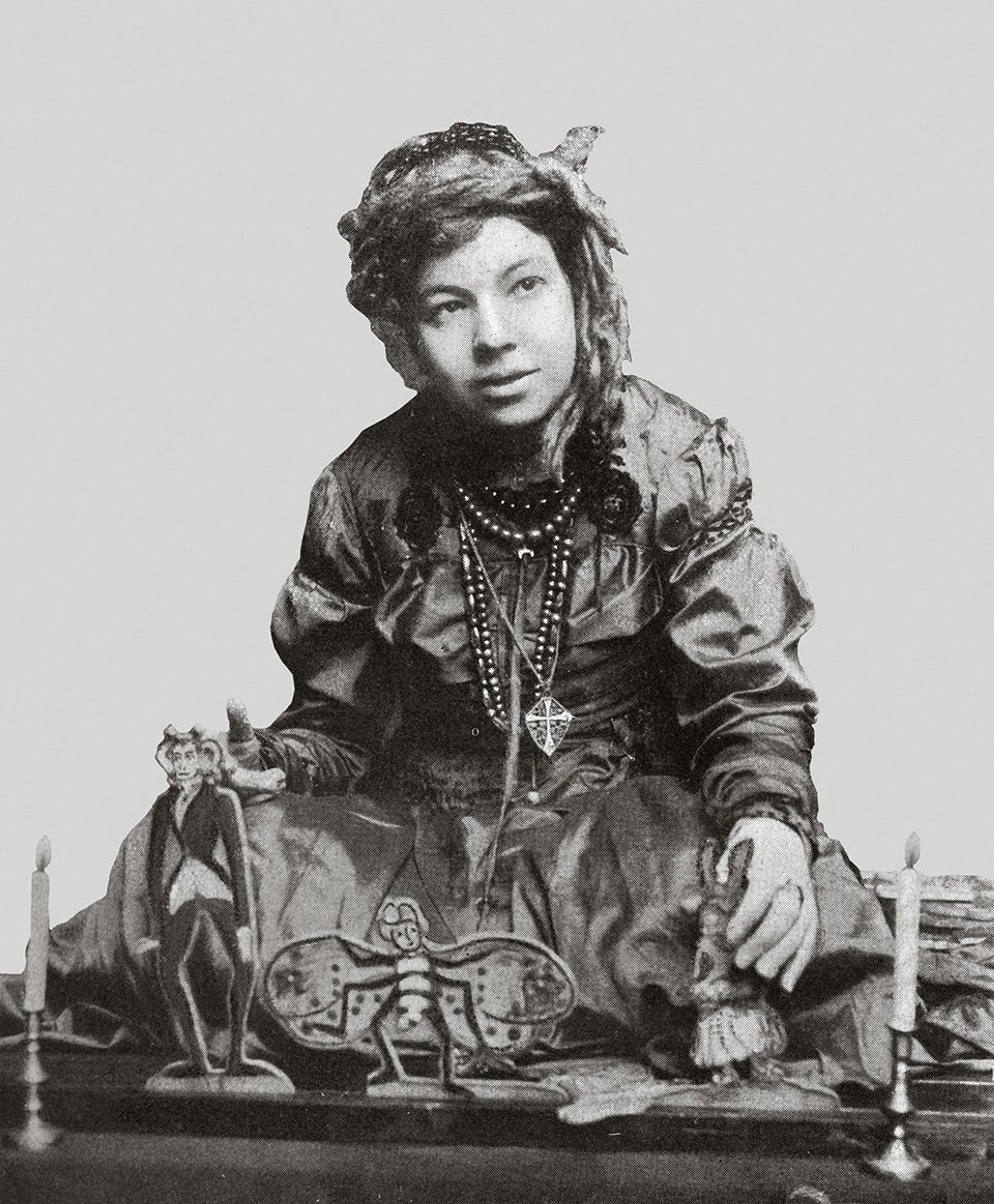 Indeed, our contemporary understanding of tarot is largely informed by the iconic imagery created by Pamela Coleman Smith for the Rider Waite Smith deck. Yet the artist's name was omitted from the published cards for decades due in large part to the fact that she was a biracial woman. Born in London to wealthy American parents who had a large circle of eclectic friends, she lived for a time in New York and Jamaica before moving back to the US in 1893 to attend Pratt Institute where she was introduced to the significant styles and ideas of the day, including Art Nouveau and Symbolism, which she deftly deployed in much of her early feminist paintings and drawings. Pamela Colman Smith with puppets she created, featured in the October 1912 issue of The Craftsman Illustrated magazine. Photographer unknown.