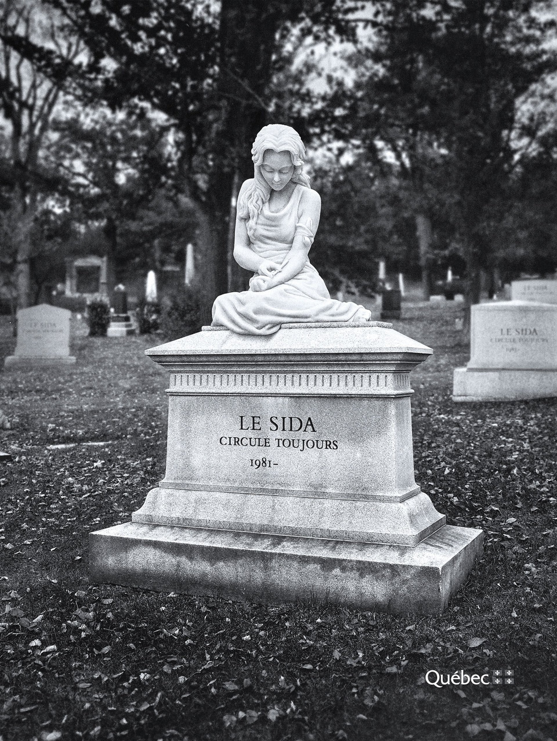 Perhaps the starkest images are three black-and-white posters by Gilles Dusablon, Linda Dawe and Stephane Gaulin from Canada, depicting statues: two show marble couples engaged in unprotected sex, another a woman injecting drugs. They are arranged on tombstones engraved with the words “Aids is still circulating”.