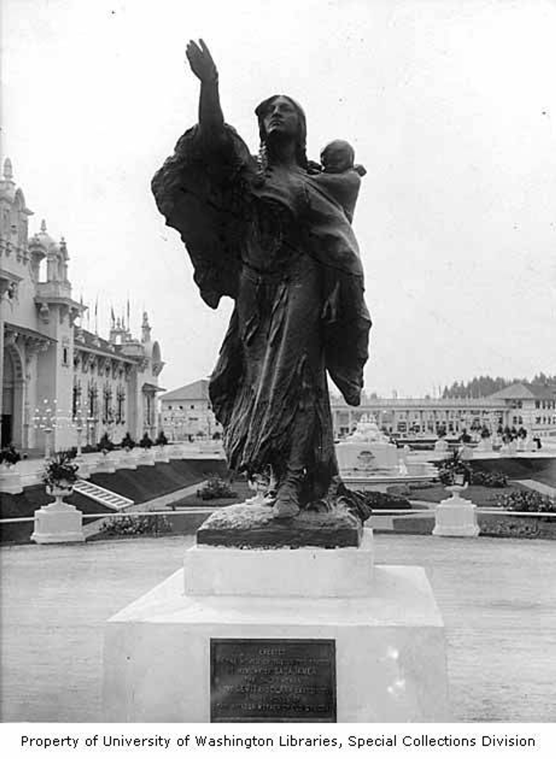 The Colorado-based sculptor Alice Cooper constructed the statue with more than 20 tons of Oregon copper. It stood in the center of the Sunken Gardens on the grounds of the 1905 Lewis and Clark Exposition in Portland. In April 1906, the statue was moved to Washington Park University of Washington Libraries, Special Collections