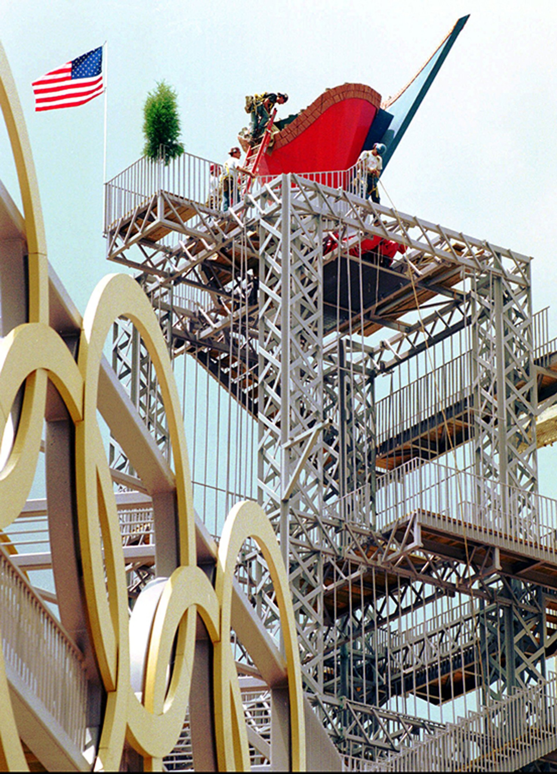 Ironworkers finish uncovering the Centennial Olympic cauldron, designed by Siah Armajani, in 1996 AP Photo/Tannen Maury