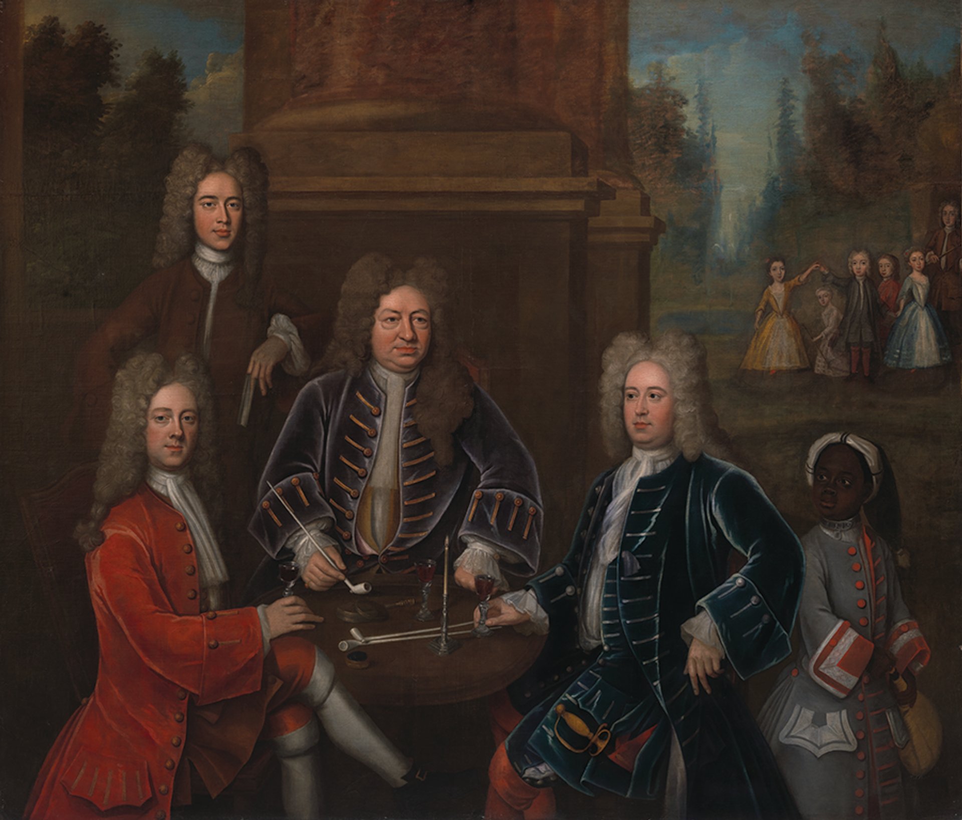 1708 painting by an unknown artist depicting Elihu Yale, one of Yale's founders, within a group portrait that also features an enslaved child Yale Center for British Art, Gift of Andrew Cavendish, 11th Duke of Devonshire