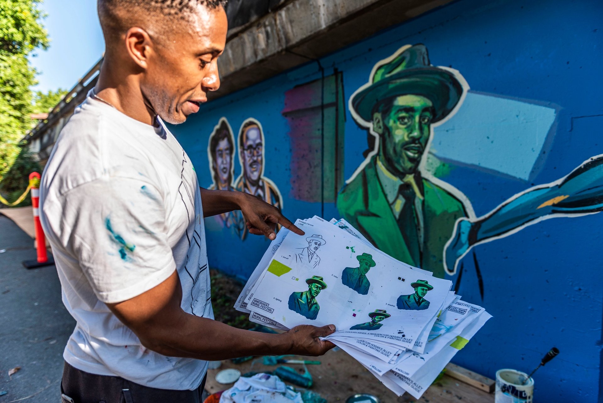 “It was hard for me not to think about the fact that I was adding art to the very instrument that led to the destruction of Hogan’s Alley,” says Joseph, who worked in animation and gaming before returning to painting. As a nod to the demolition, “I put the majority of the mural within clouds of smoke from which historical faces of Hogan’s Alley arise.”
