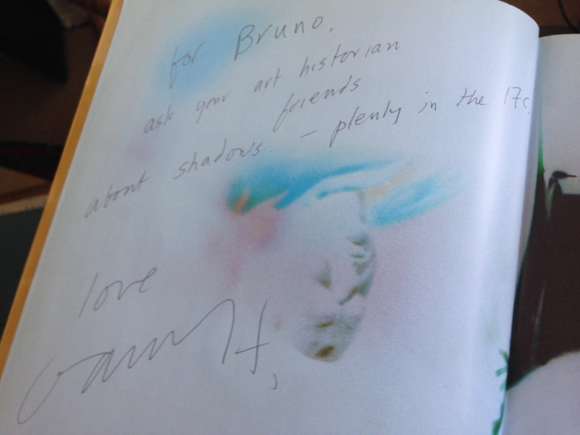 David Hockney's inscription which reads: "For Bruno, ask your art historian friends about shadows—plenty in the 17c. love David H."