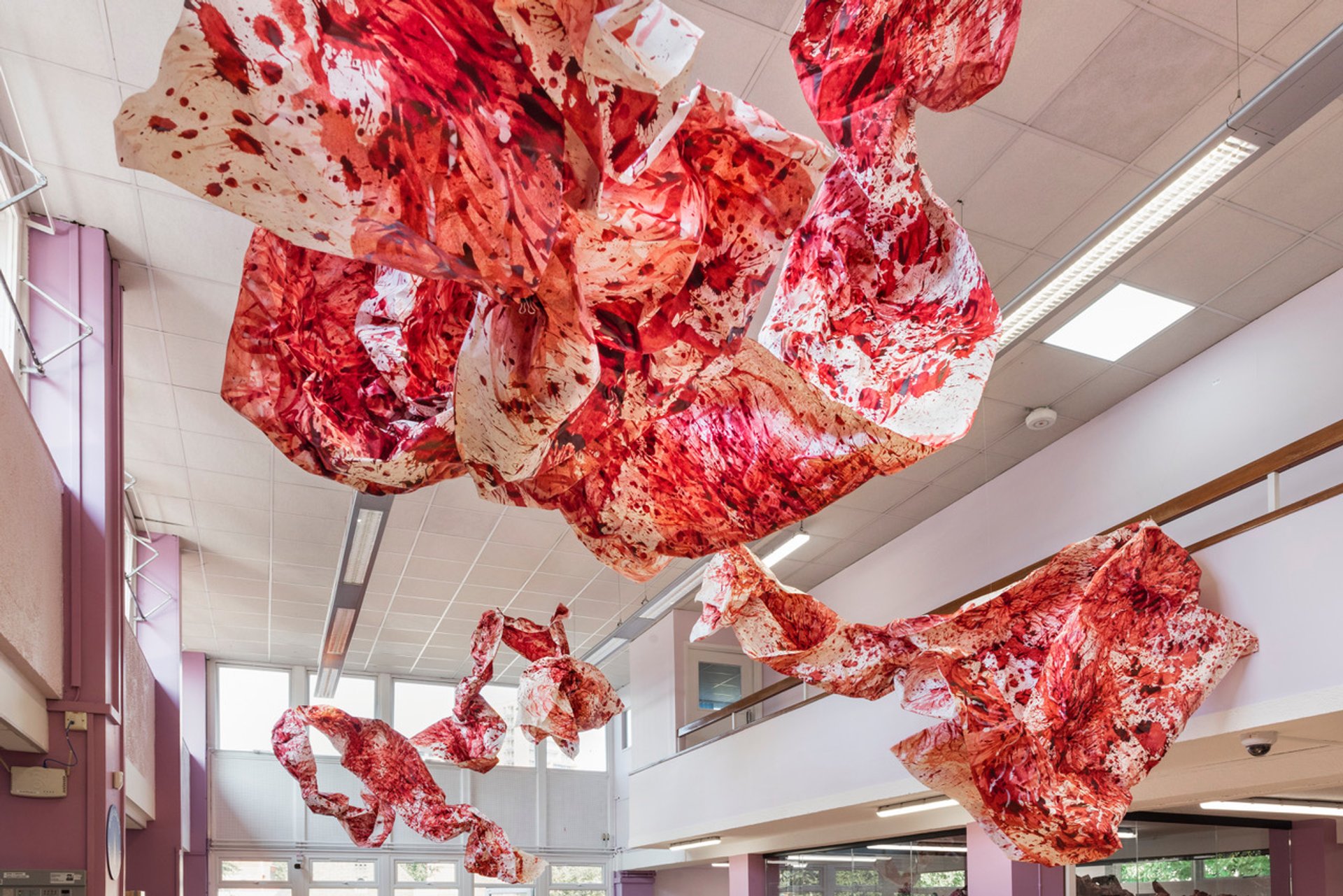 The Pakistani artist Imran Qureshi’s dramatic and unsettling intervention into the Ealing Road Library’s main atrium And they Still Seek Traces of Blood suspends large twisted flourishes of paper splattered in gore-red paint overhead. Thousands more crumpled, paint stained paper sheets are also crammed into a glass-walled chamber. Social distancing forbids physically rummaging and getting submerged in the balled-up paper mountain, but their packed forms still have a stifling presence. These audacious sculptural works play with and off the two delicate paintings rendered by Qureshi in traditional Mughal miniature style, which in turn are quietly subverted by showers of meticulously-executed bloody droplets.