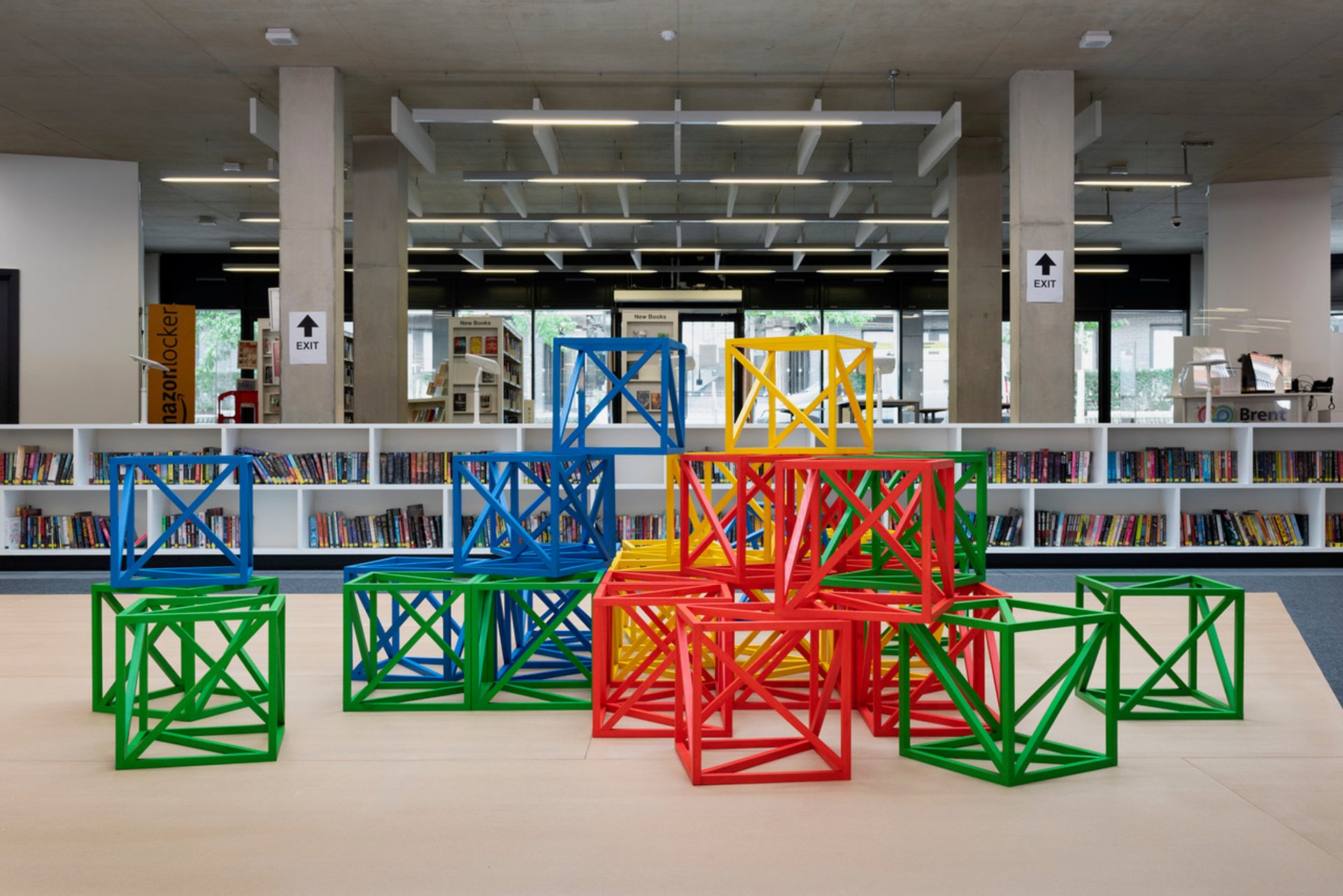 Thirty-six of the Karachi-born, Cricklewood-based artist Rasheed Araeen’s trademark lattice cubes painted in bright red, blue, green and yellow have been placed in Willesden Green Library’s central space. Visitors, and especially children, are encouraged to arrange and move them around at will. Both democratic and rigorous, they form an anarchic as well as an orderly presence. After all, you are not meant to mess with Minimalist sculpture and certainly not in a library. An accompanying exhibition of geometric paintings and drawings also pays testament to the Arabic poets, philosophers and non-Western modernities that have fed into the radical conceptual work of Araeen. Now acknowleged as one of the UK's most important artist-activists, he is renowned for mixing things up and fighting prejudice for over half a century.